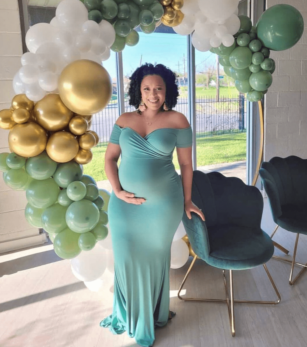 Paired perfectly with her matching balloons, Mama @moderndae wears our Off the Shoulder Sweetheart Flare Gown in Olive!