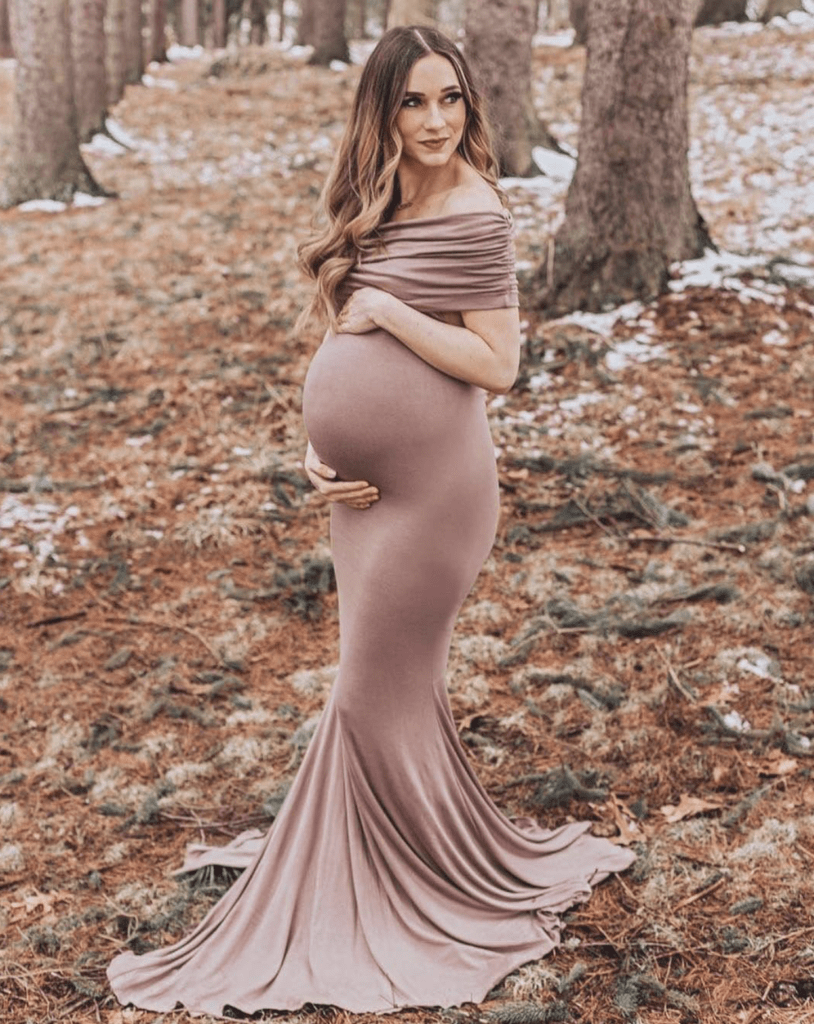 A hint of snow, the fading colors of nature, and a beautiful mama make for a stunning photo session. Mama @the_cityfarmhouse is wearing our Ruched Fold Over Flare Gown in Taupe, a classic Fall color. The brown tones in her gown compliment the rust-colored shades of the backdrop, creating a romantic and elegant look.