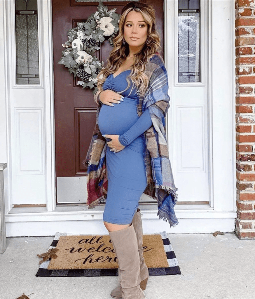 Denim Blue is one of the top colors of Winter because of its versatility! It looks beautiful on its own or paired with cozy accessories, like shown here. Mama @_meg_leigh styled her Off the Shoulder Ruched Maternity Dress with Long Sleeves with high boots and a cozy plaid wrap for an effortlessly cute Winter look.