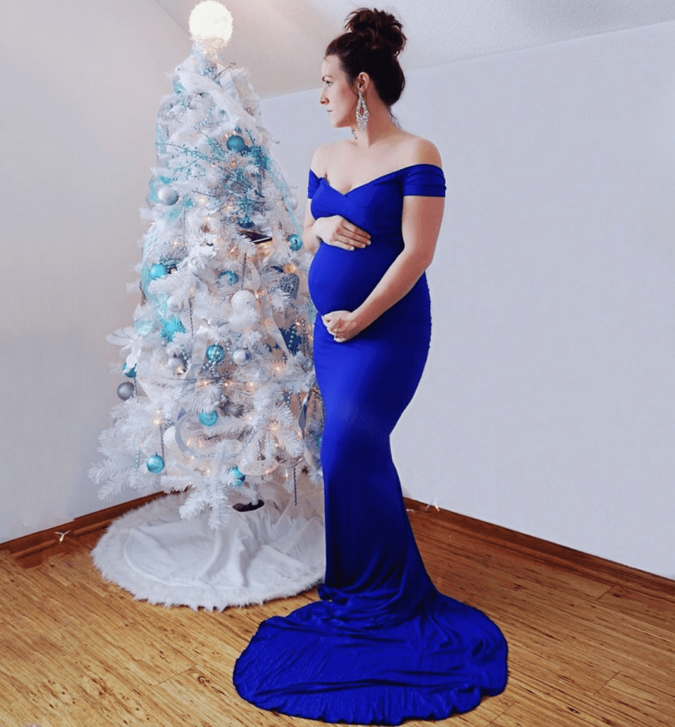 Stunning by the Christmas tree, Mama @honestlymommy is wearing the Off the Shoulder Sweetheart Gown with Train in Royal Blue. Perfect for photoshoots like here, your baby shower or every day too, Royal Blue is perfect for Winter. The cool tone of it compliments the icy atmosphere Winter brings.