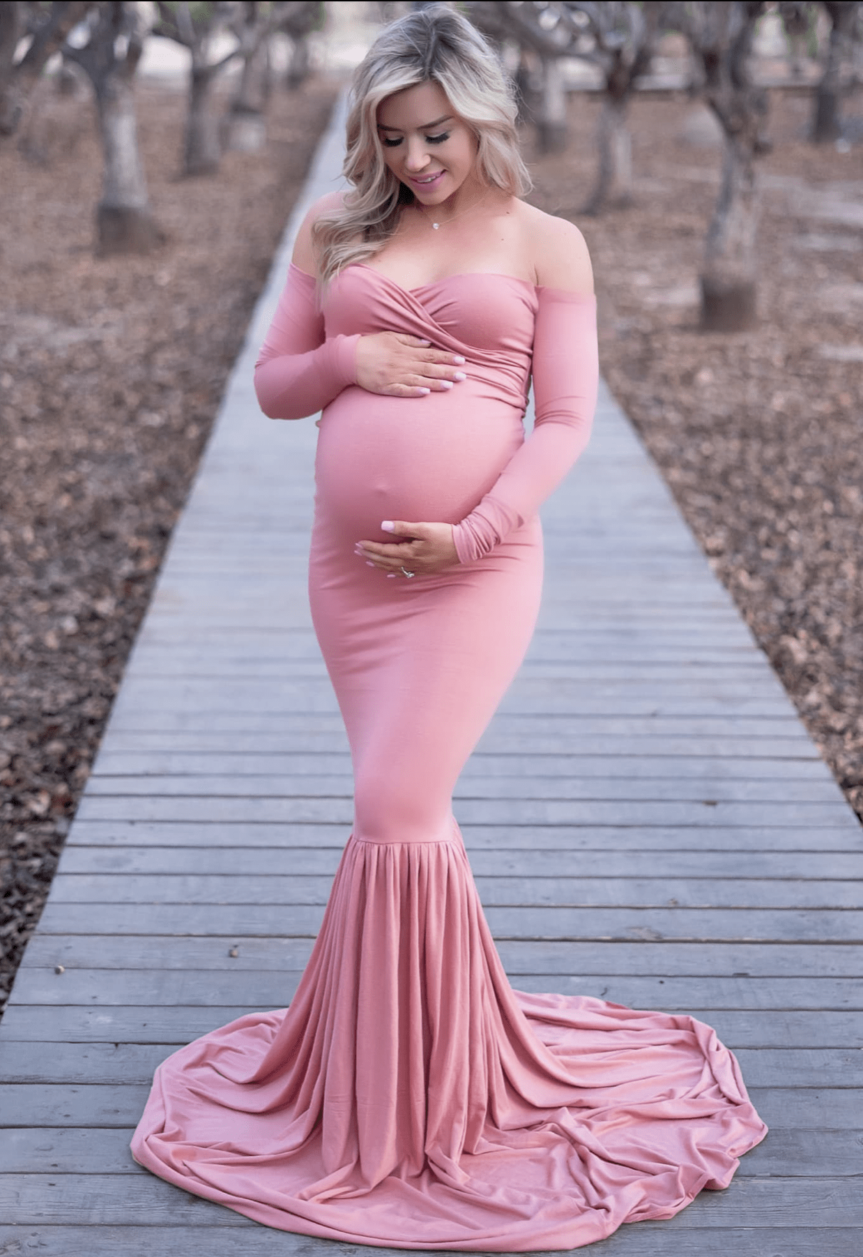 Mama @chelseybrookefitnes is wearing our Long Sleeve Sweetheart Mermaid Gown in Dusty Pink. Doesn’t she look so stunning?!