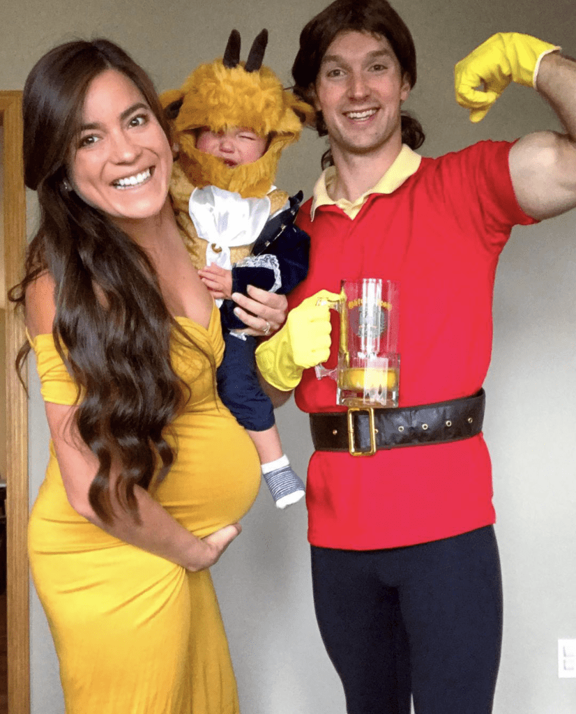 We love family coordinated costumes like this Beauty and the Beast themed family! Mama is wearing our Off the Shoulder Sweetheart Slim Fit Gown in Gold, and wow, does she look like Belle!