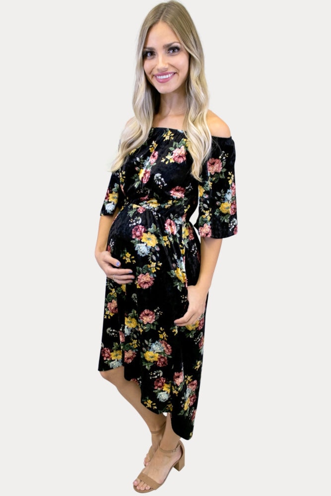 Off the Shoulder Midi Maternity Dress with Long Sleeves