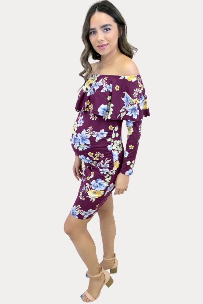 Off the Shoulder Ruched Maternity Dress with Long Sleeves