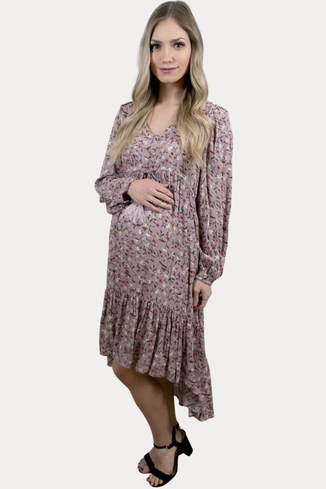 Long-Sleeve Fold Over Ruched Maternity Dress with Lace