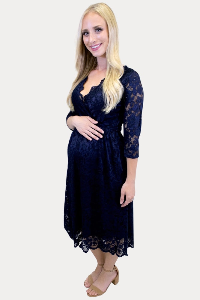 Long-Sleeve Fold Over Ruched Maternity Dress with Lace