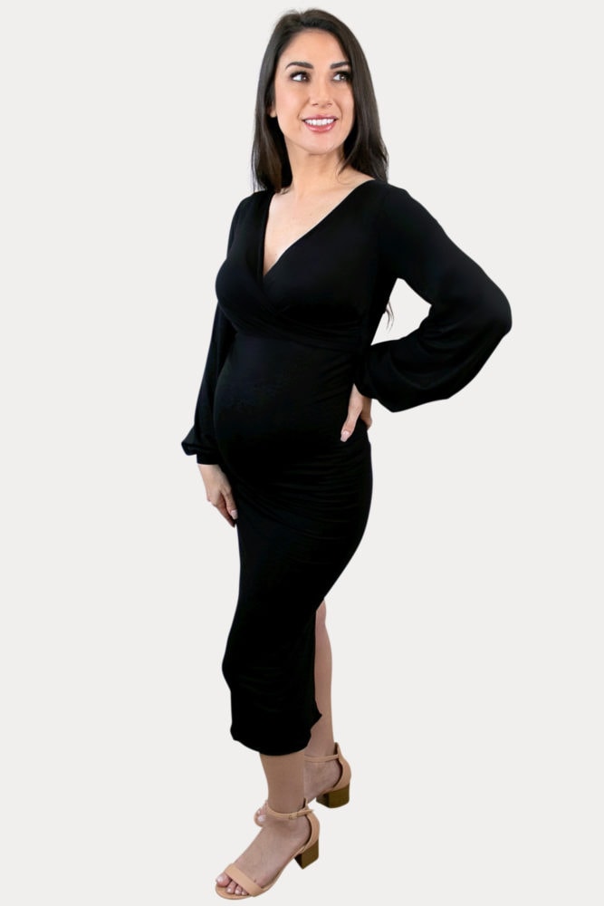 Long Sleeve Fold Over Ruched Maternity Dress with Side Slits