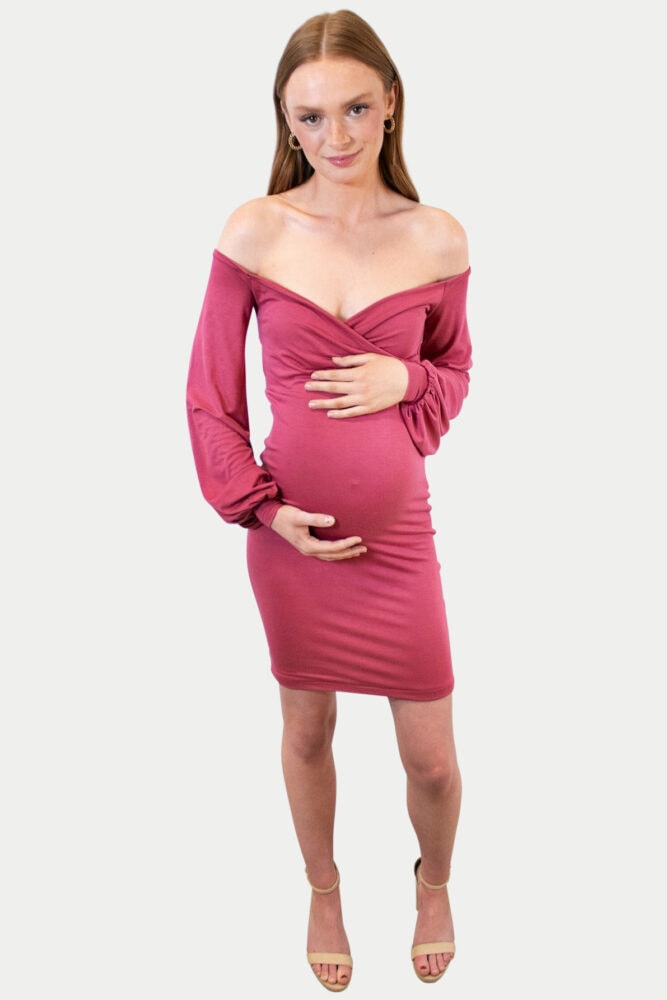Off the Shoulder Midi Maternity Dress with Long Sleeves