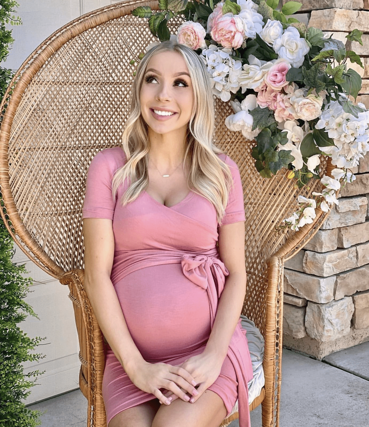 Adorable as can be, Mama @_.emsxxo is wearing the Ruched Front Mini Bell Sleeve Maternity Dress in what else, but Blush Pink!