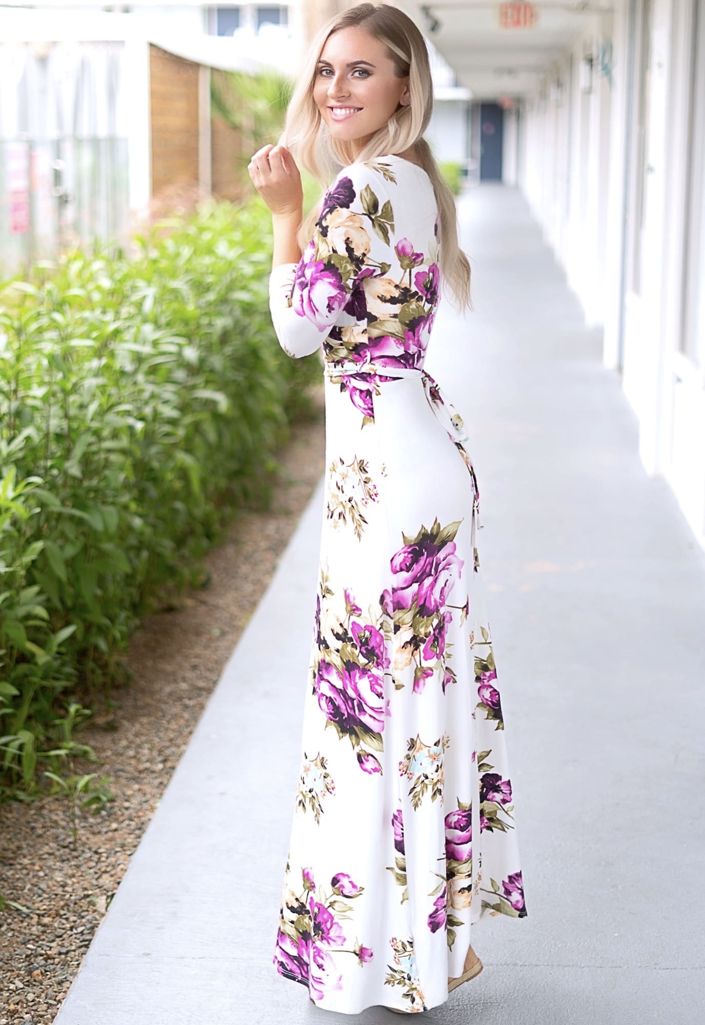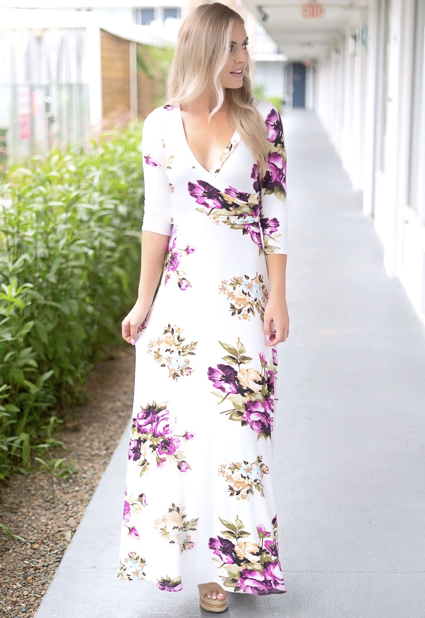 This maxi 3/4 sleeve wrap dress will have all eyes on you! With magenta and blue floral accents, this dress is perfect for any occasion. The ultra-soft fabric will have you feeling as good as you look! This pregnancy wrap dress is the perfect addition to every wardrobe.