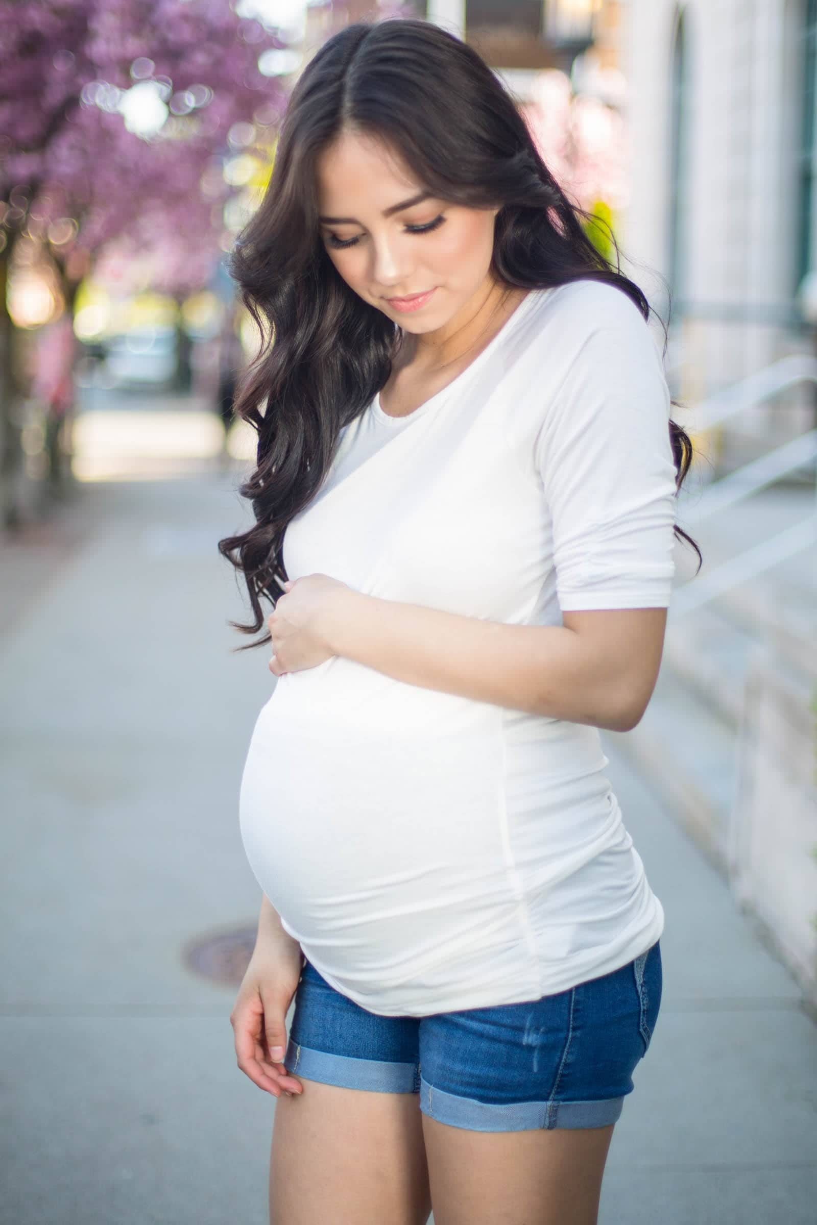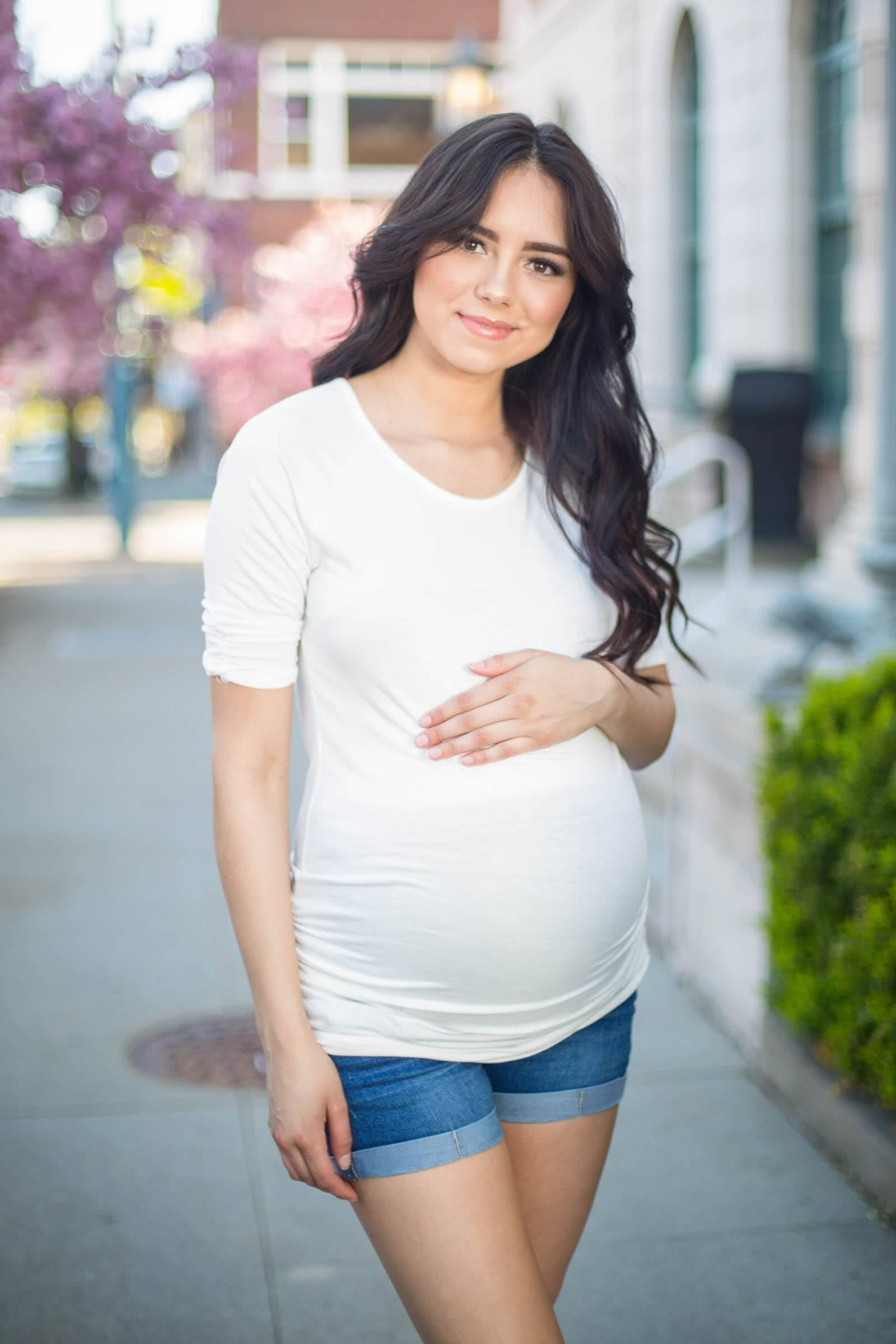 You just met the perfectly fitting, completely basic maternity tee! Us girls know, when you find the perfect thing, double and triple up. Cream, scoop neck, 3/4 sleeve fitted maternity tee with ruching on sides and sleeves. With just a little extra length this shirt flatters every body type and a growing bump.