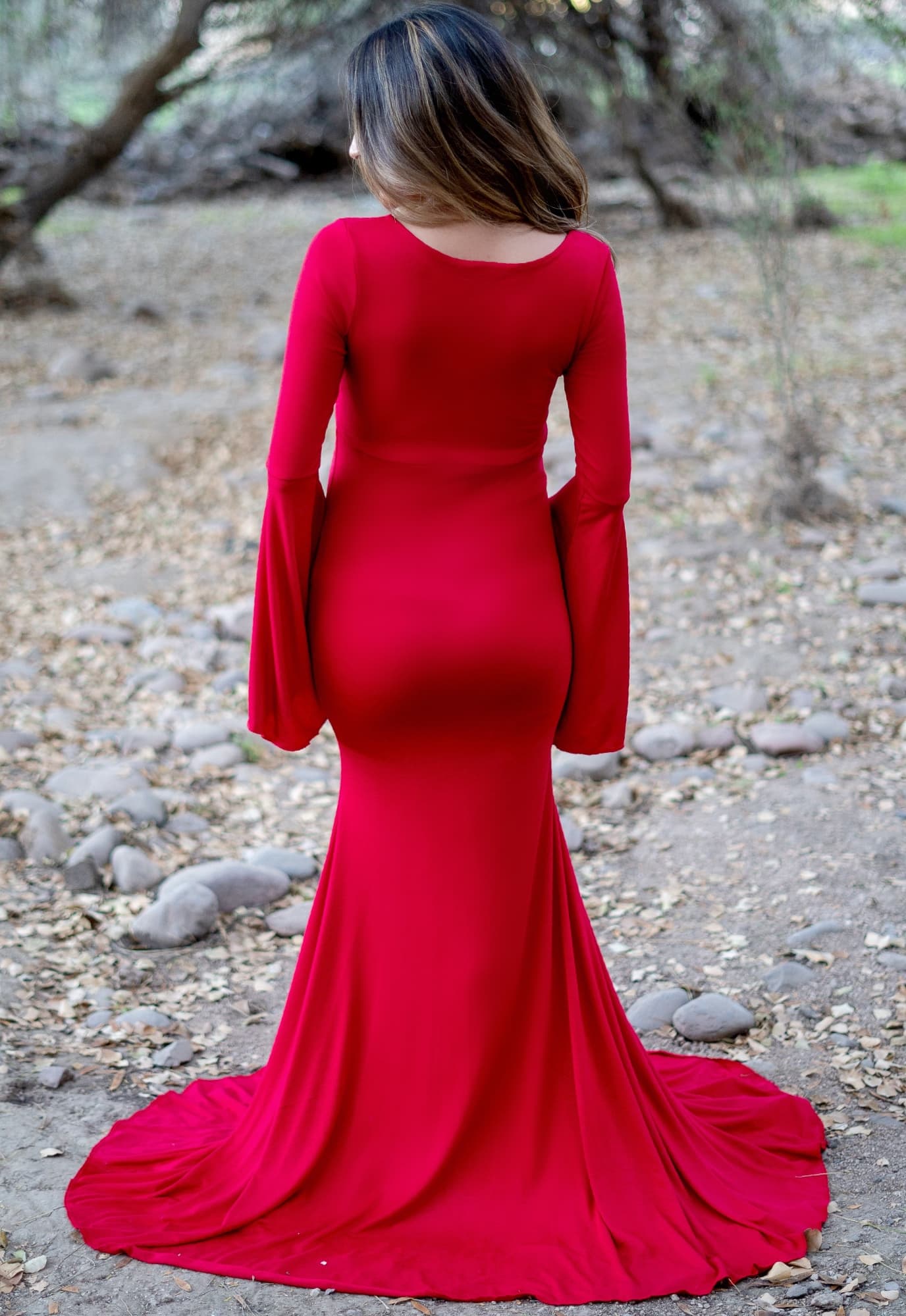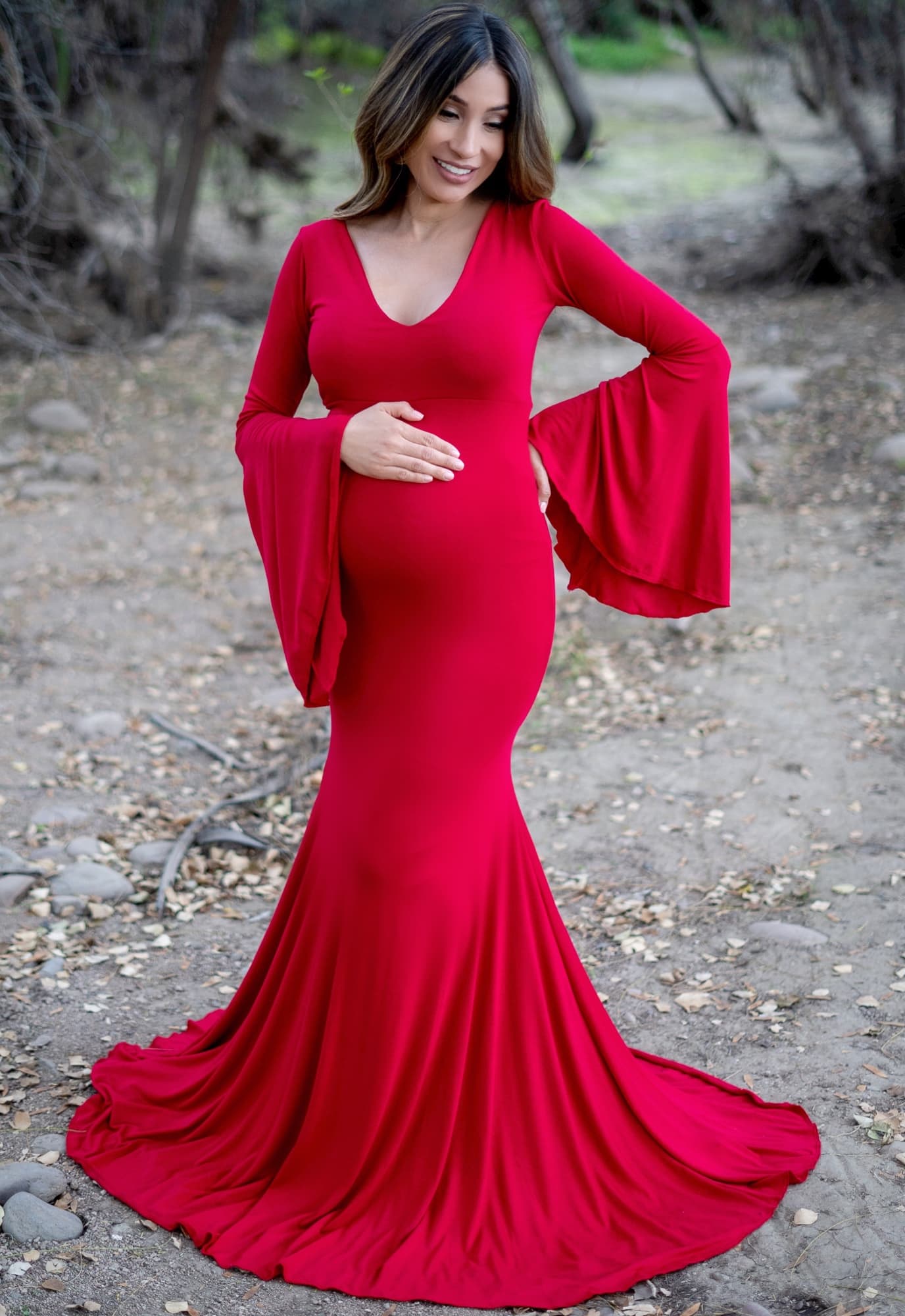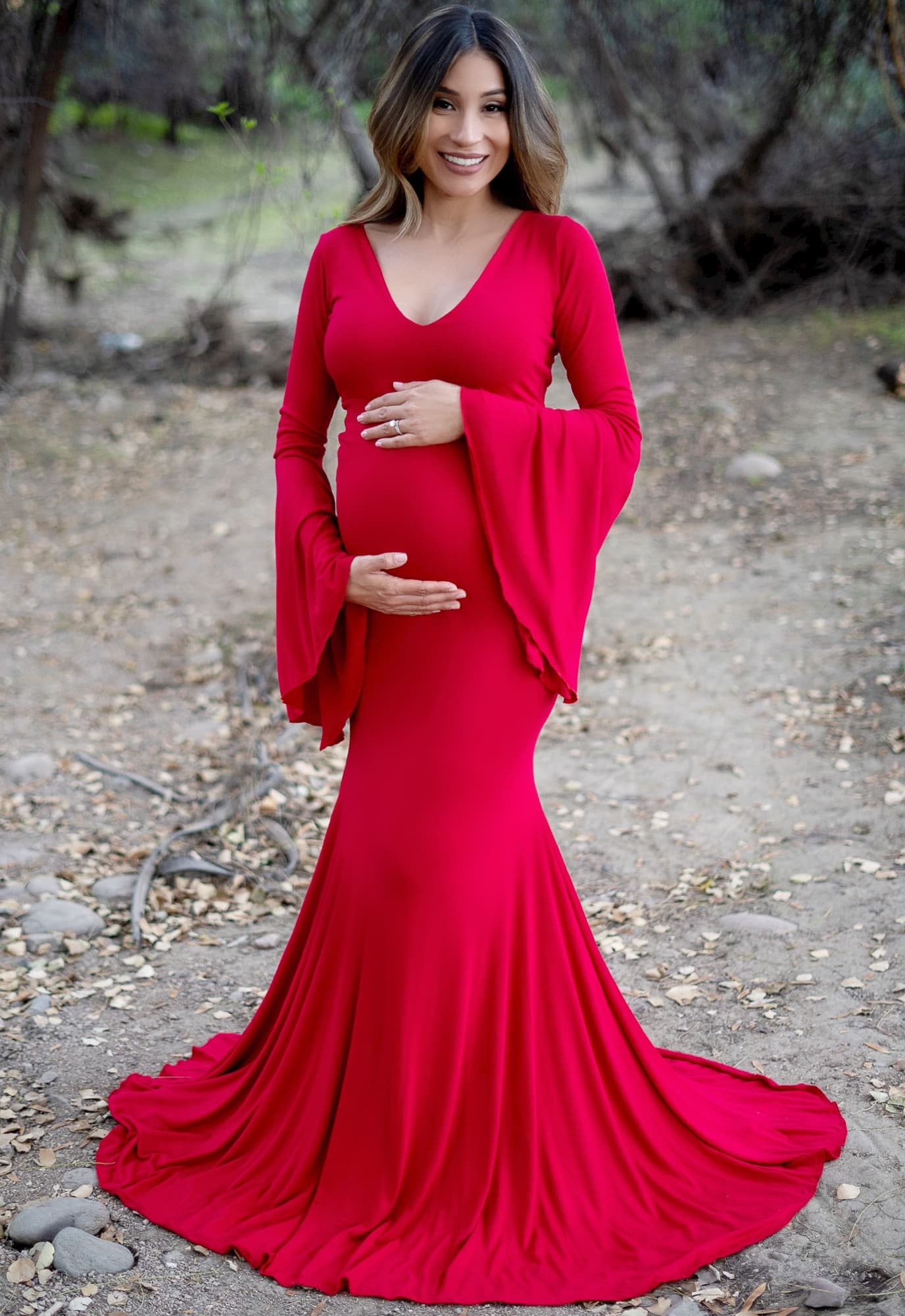 This bell sleeve maternity flare gown is breathtaking! It features a scoop neckline with dramatic bell sleeves. The slim fit bodice coupled with a flare bottom are perfect for an indoor or outdoor maternity shoot, a baby shower or any special event! It is constructed of a premium stretch material that allows comfort while looking your best.