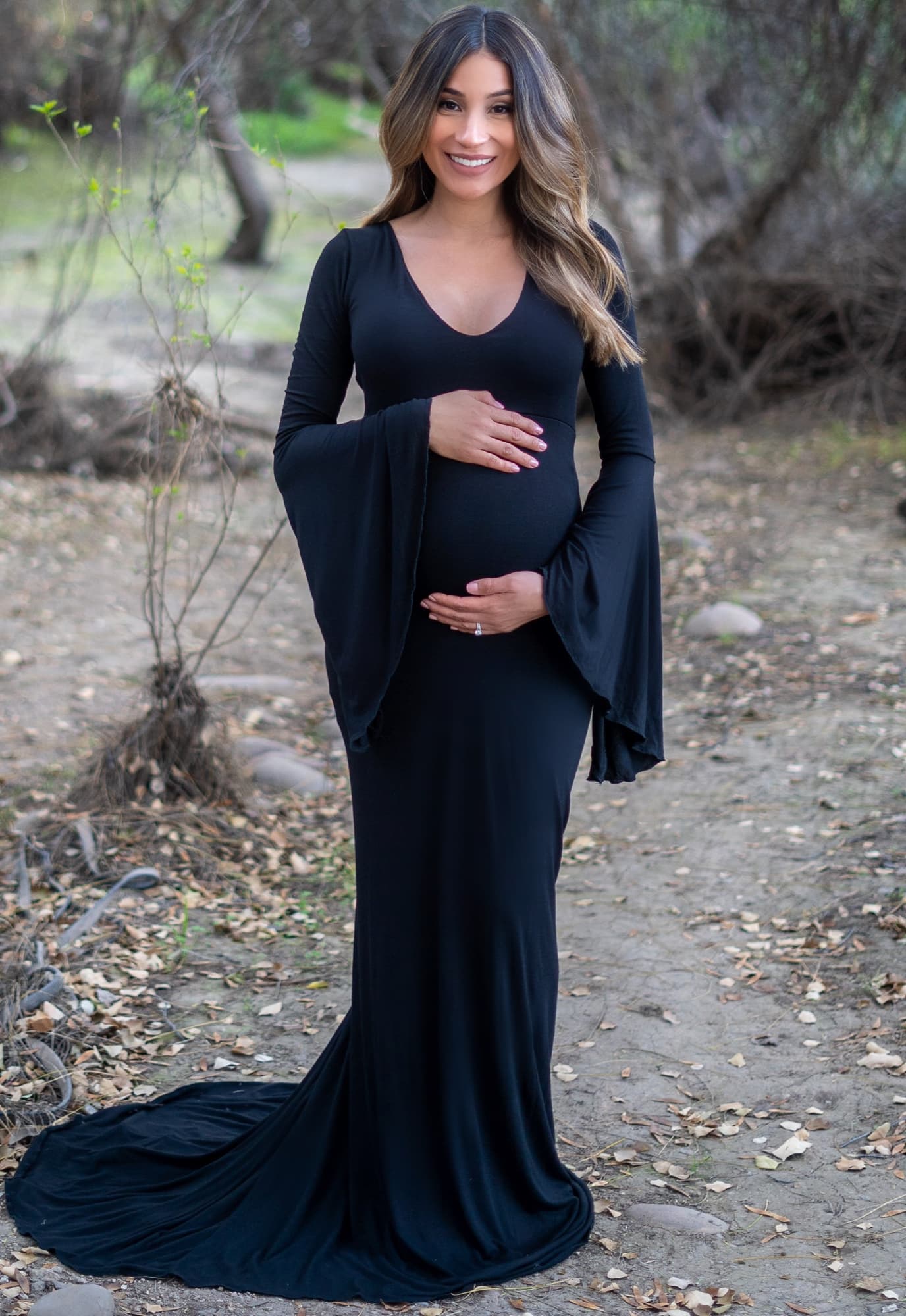This bell sleeve maternity gown with a mini train will take your breath away! It features a scoop neckline with dramatic bell sleeves. The slim fit bodice coupled with a gorgeous mini train creates a beautiful photoshoot effect. It is constructed of a premium stretch material that allows comfort while looking your best.