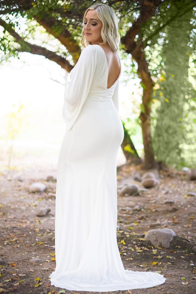Our Bell Sleeve Maternity Wedding Dress is take your breath away beautiful for your big day! With angelesk bell sleeves, a slim fit bodice, and a simple flare that drapes the ground, this gown screams elegance. Constructed of a premium stretch material that allows comfort while looking your best. (Pictured in Cream.)