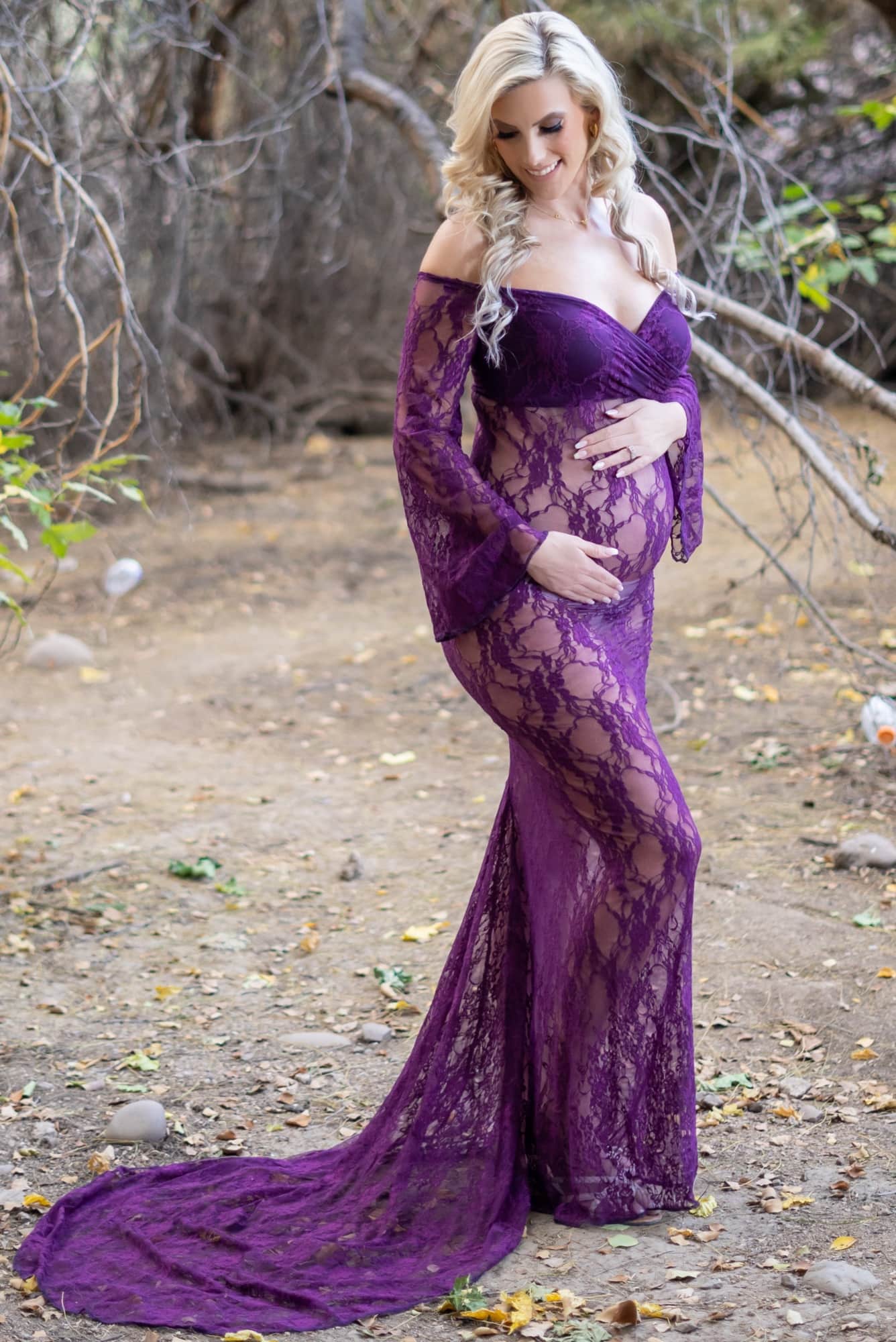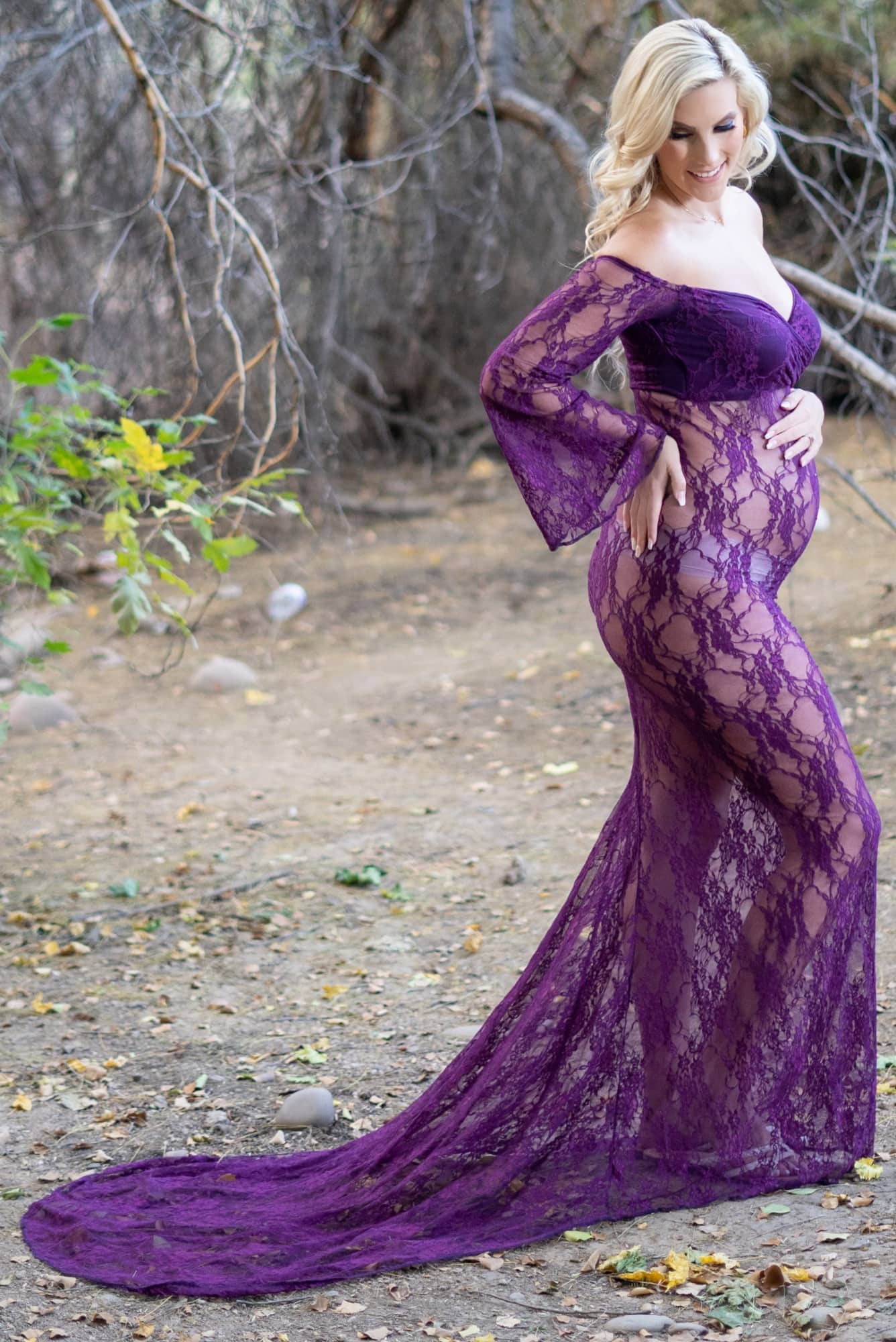 This bell sleeve pregnancy gown with train is a sexy maternity gown that will have all attention on you and your bump. This dress is a premium stretch lace and is specifically for maternity photoshoots and boudoir. The sweetheart neckline is lace, with a stretch lining in the bust area. It has beautiful lace bell-sleeves for a touch of elegance. Celebrate your baby bump in pictures to treasure for a lifetime! (Pictured in Plum.)