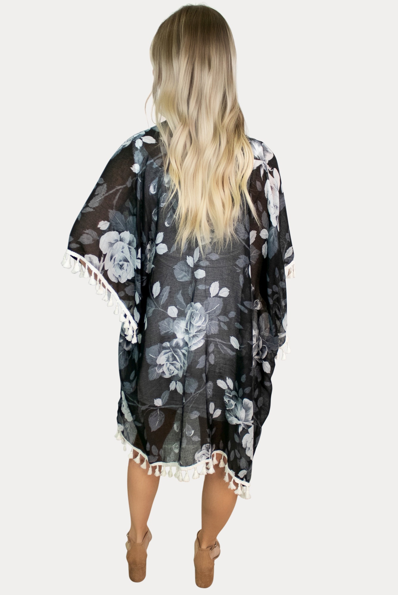 This black floral maternity kimono is a must have for any mama looking to make a statement! It features cute tassels, soft material and stylish florals. Perfect for dressing up your basics or keeping in casual chic. It pairs with both denim and dresses! Wear throughout pregnancy and beyond.