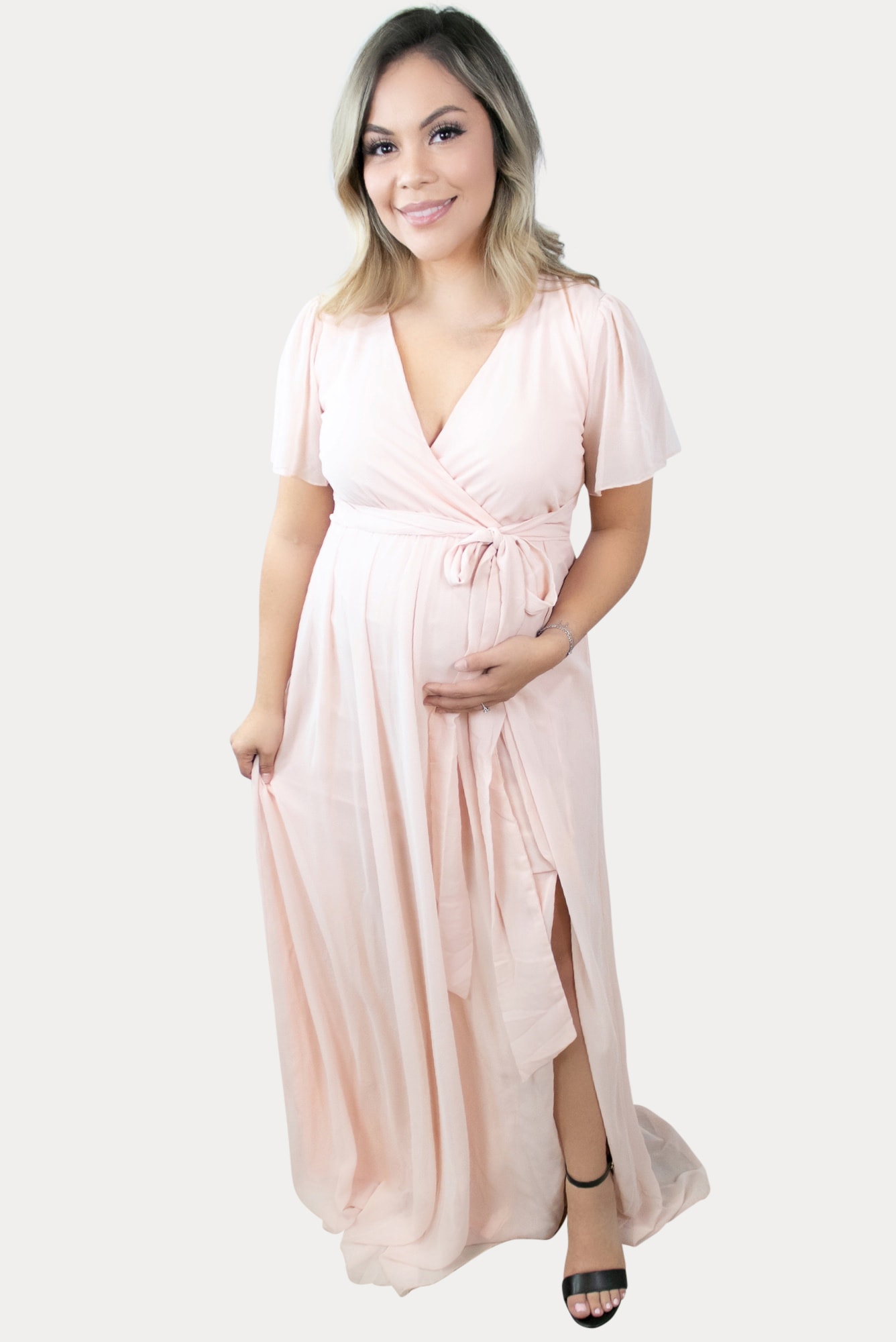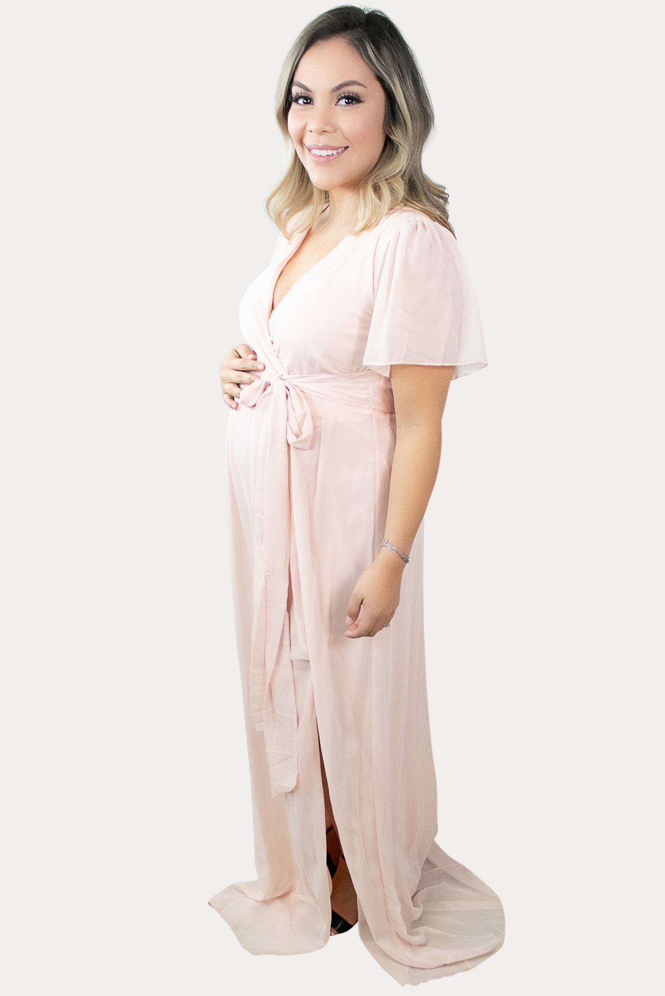 Our blush maxi maternity dress with sweetheart neckline is stunning and beautiful! With short flowing sleeves, and tie front waist, this dress is sure to flatter every mama-to-be. Made of a delicate chiffon fabric with a sexy front slit, you’re sure to feel absolutely stunning! Great for a special occasion, date night, or photoshoot! This elegant sweetheart pregnancy maxi is perfect throughout all nine months of pregnancy and beyond.