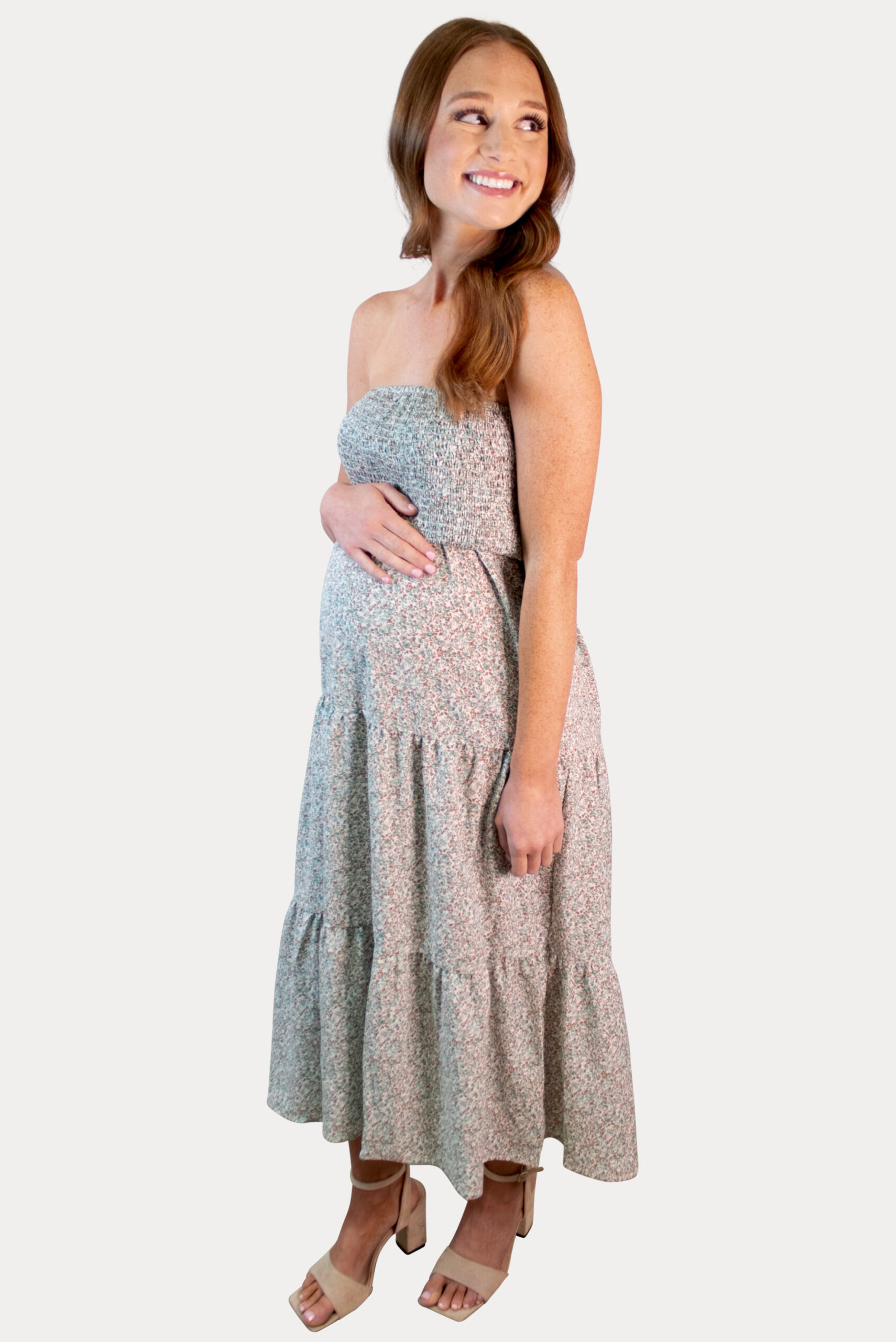 This strapless boho floral maternity dress is classic floral fun! Constructed of flowy fabric to create the ultimate combination of comfort and style. This dress features a smocked bust with a flowy layered fit. Style with heels or keep it beachy with a pair of sandals. A total win throughout pregnancy and beyond!