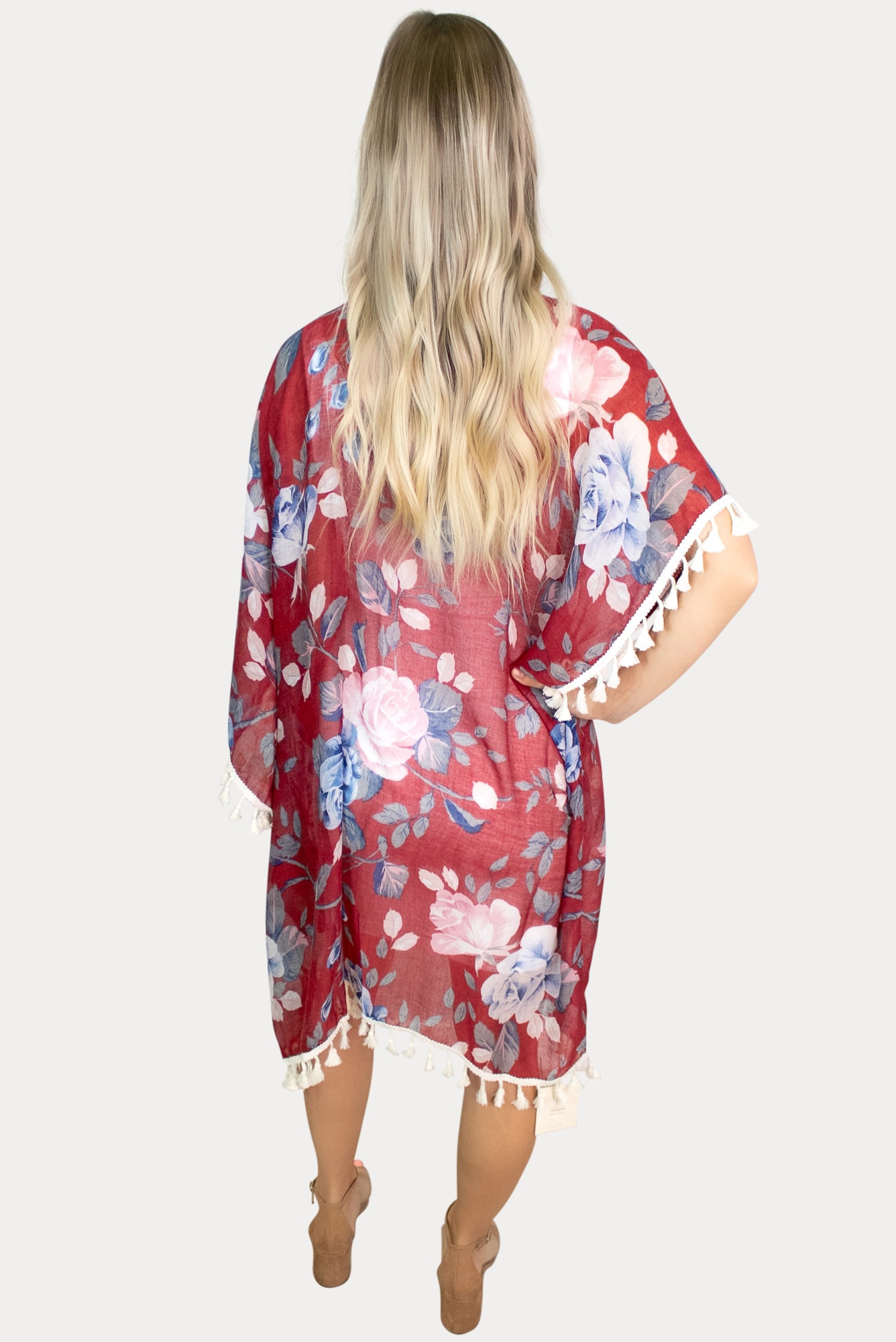 This burgundy floral pregnancy kimono is a must have for any mama looking to make a statement! It features cute tassels, soft material and bold florals. Perfect for dressing up your basics or keeping in casual chic. It pairs with both denim and dresses! Wear throughout pregnancy and beyond.