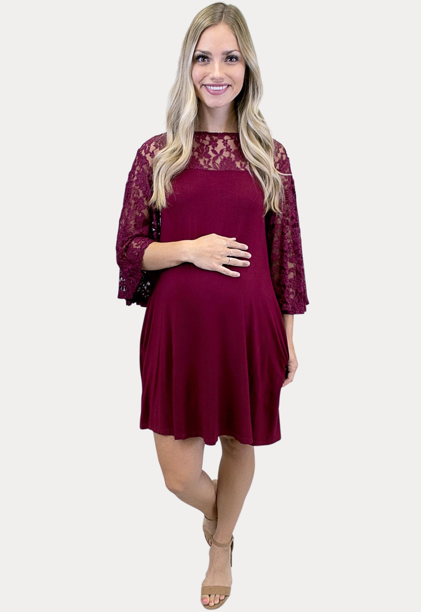 This burgundy lace maternity dress is great for every occasion! Features a high neck, flowy sleeves and the perfect thigh high length. Our lace detailed dress is sure to flatter every mama-to-be. Perfect for a baby shower, gender reveal, or any special occasion. This maternity dress is perfect for all nine months of pregnancy and beyond.
