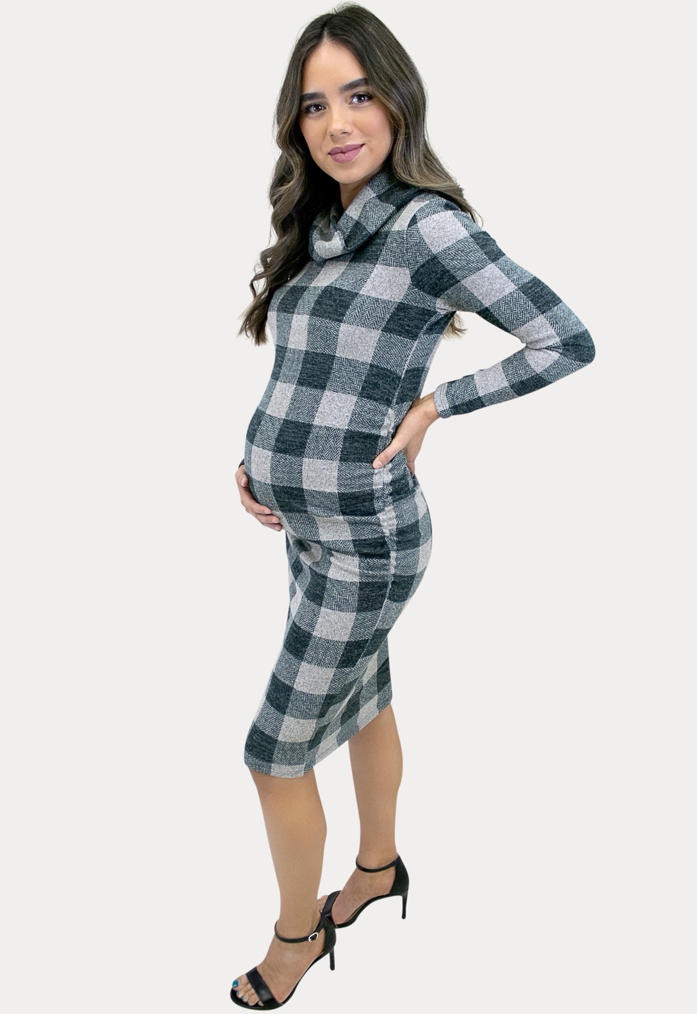 A cool weather staple every mama needs! This cowl neck plaid pregnancy dress in green is lightweight, cozy and features a stylish print. Trendy and flattering! The super soft fabric will keep you comfortable and warm during those brisk days. Dress it up with a cute pair of heels or down with some cute sneakers. This plaid maternity dress is ideal to wear throughout pregnancy and beyond!