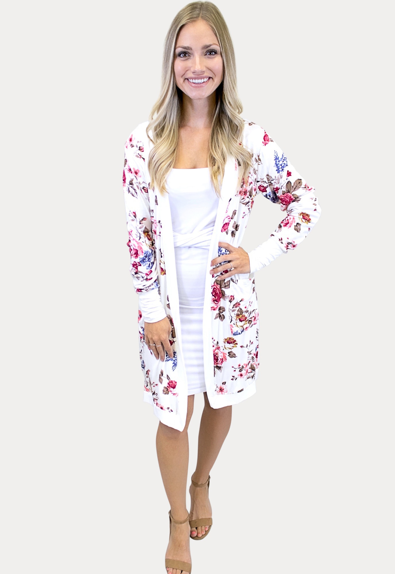 This super soft, lightweight cream floral cardigan is a layering essential. Oversized cuffs with deep pockets. Pairs perfectly with Sexy Mama denim and dresses. The perfect addition for every wardrobe. Spice up your outfit with our cream floral cardigan.