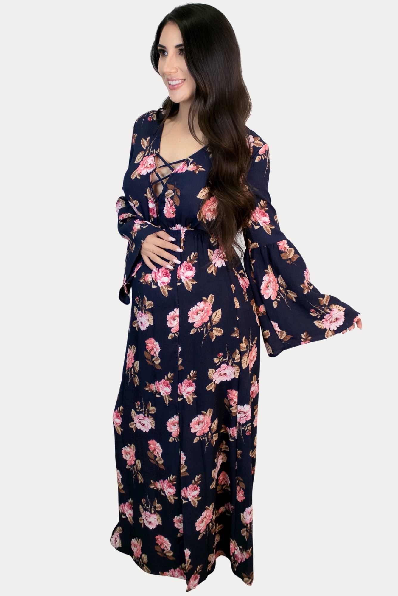 A flattering dress every mama needs! This criss-cross floral maternity maxi is stylish and elegant. With a criss-cross tie front detail and slit down the front, this dress is sure to flatter every mama-to-be. Great for a special occasion, date night, or photoshoot! This floral maternity dress is perfect throughout all nine months of pregnancy and beyond.