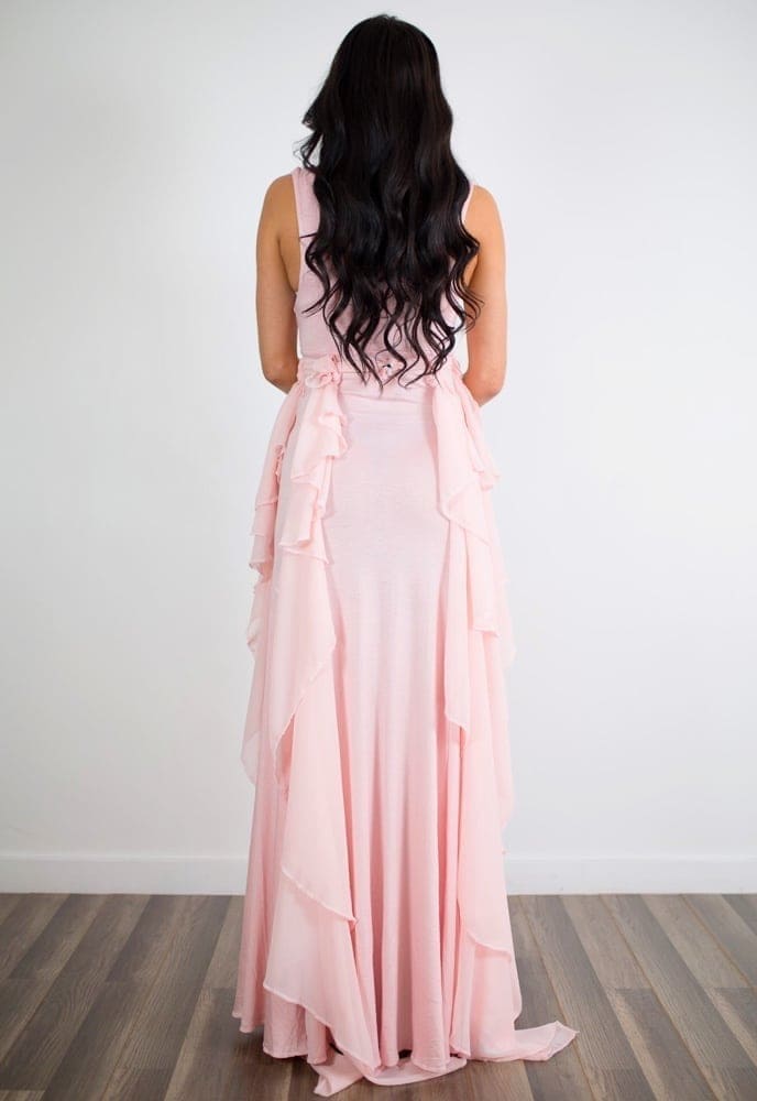 You’ve found the perfect photoshoot gown! This v-neck gown with a detachable chiffon train is absolutely stunning. This cute maternity gown is constructed of comfortable premium stretch material and comes with a detachable 50″ chiffon train. This gown is for those looking to achieve a complete wow factor. Ideal for any breathtaking or elegant setting. Align the chiffon waves on the seams. (Pictured in Blush Pink.)