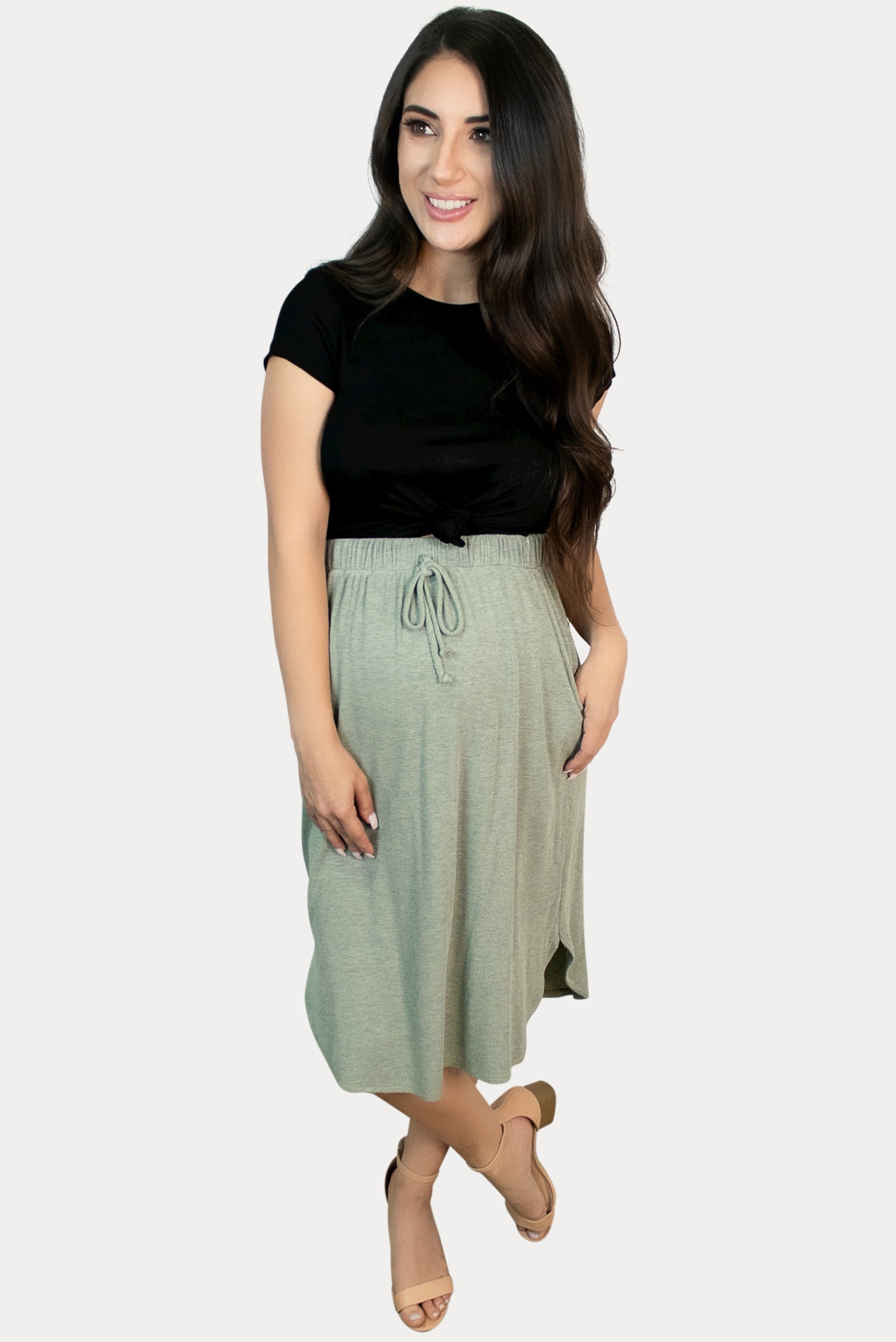 This ribbed drawstring maternity skirt is both flattering and cute! Perfect for providing your baby bump with ultimate comfort and a whole lot of style with trendy sage color. The ultra-soft is perfect for daily wear, while the drawstring waist provides endless comfort. This stylish skirt pairs perfectly with our Sexy Mama basic crops and t-shirts! Grab a cute maternity skirt today and love it all the way throughout pregnancy and beyond.