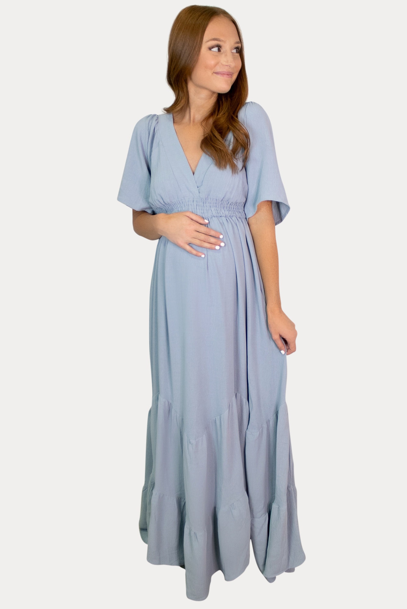 Our elegant v-neck maternity maxi in blue is unique and beautiful! With mid-length flowing sleeves, no zipper, and elastic waistband, this dress is sure be comfy and flatter every mama-to-be. Great for a special occasion, date night, or photoshoot! This elegant v-neck pregnancy maxi is perfect throughout all nine months of pregnancy and beyond.