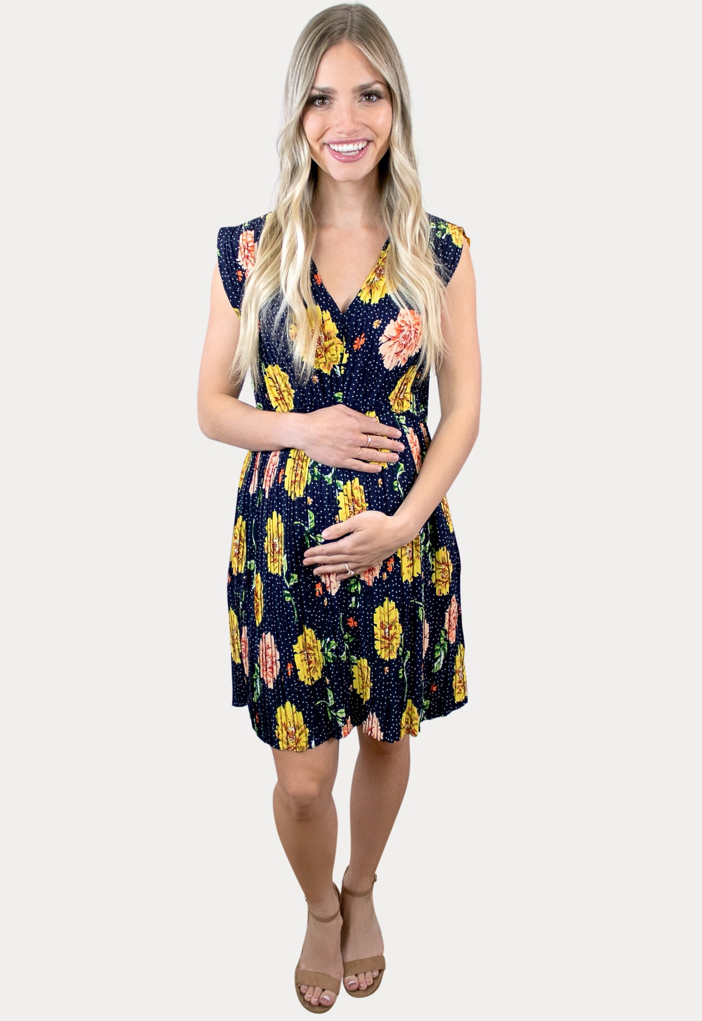 Looking to update your wardrobe? Our sleeveless floral pregnancy dress is the perfect addition! Features a v-neck, beautiful floral and polka dot pattern and a flowy fit! The perfect dress for a quick, cute and comfortable outfit. Dress up with your favorite pumps or throw on your best sandals for a more casual look. Perfect to wear throughout all nine months of pregnancy and beyond.