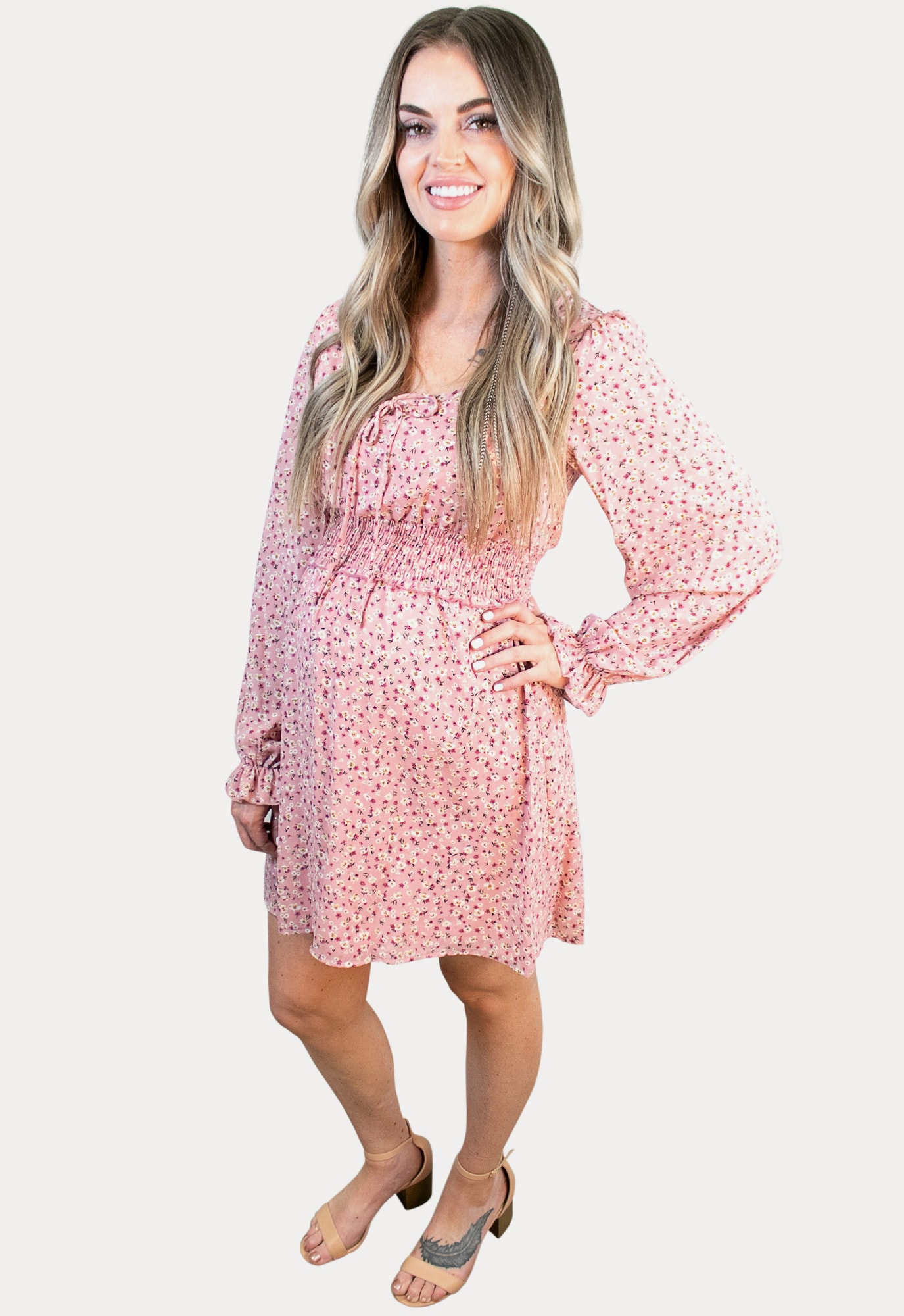 Trendy print alert! Our Pink Floral Pregnancy Dress is a stylish must have piece for every mama’s closet. Great for Sunday brunch, a lunch date or everyday wear. Features a fun deep v-neck, open back, long sleeves with a flared bottom! It is perfect to wear throughout all nine months of pregnancy and beyond.