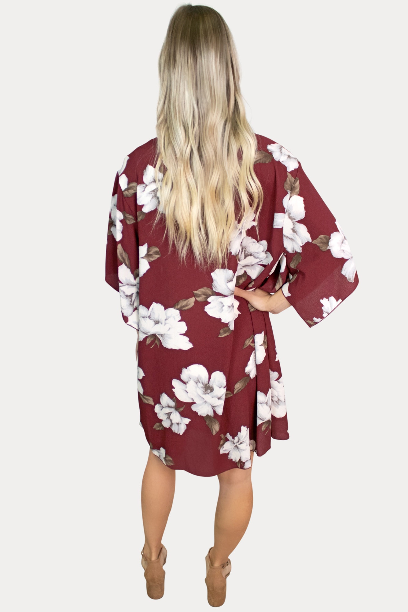 The perfect lightweight floral maternity kimono has arrived to make every outfit pop! Features a striking wine with a white floral pattern, short sleeves, and an open front. Pairs perfectly with denim, dresses, and is perfect to complete any look. A total win to wear throughout pregnancy and beyond.