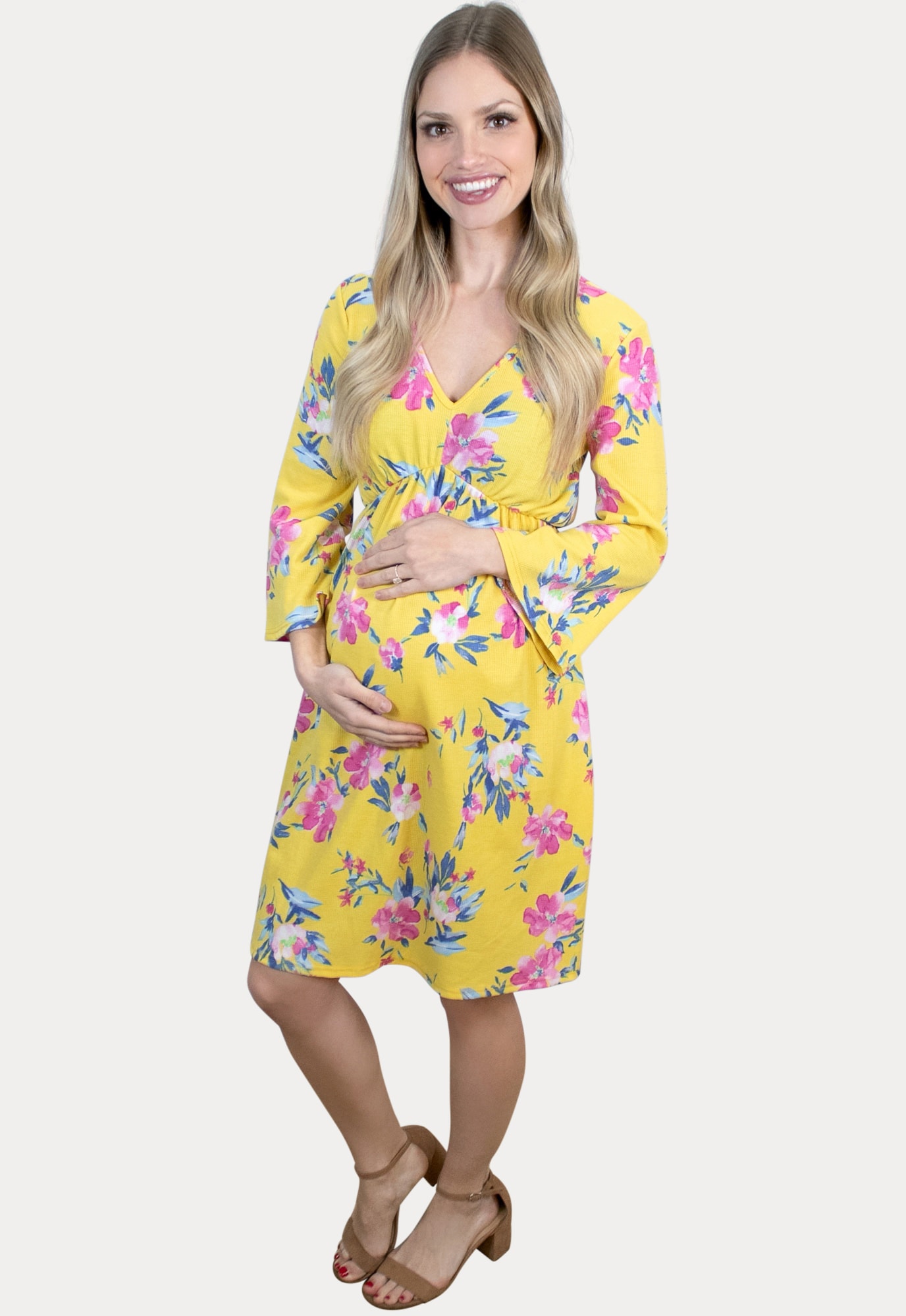 This bright and cheery floral pregnancy dress will have you looking and feeling your best! It features a thicker, ultra soft material with 3/4 sleeves. The v-neck gives you a chic look while the relaxed fit ensures comfort and style! Great for a baby shower, Sunday brunch, or everyday wear. Ideal to wear throughout pregnancy and beyond!