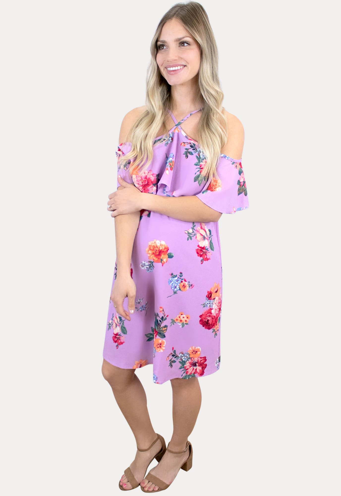 This gorgeous floral purple maternity dress was born to be in your wardrobe! Features a unique off the shoulder, cold-shoulder style! With a flowy fit and a ruffle on top, this dress is perfect for any mama. It’s the perfect dress for a quick and cute outfit. We know those are definitely essentials for maternity clothes! Designed to wear throughout pregnancy and beyond!