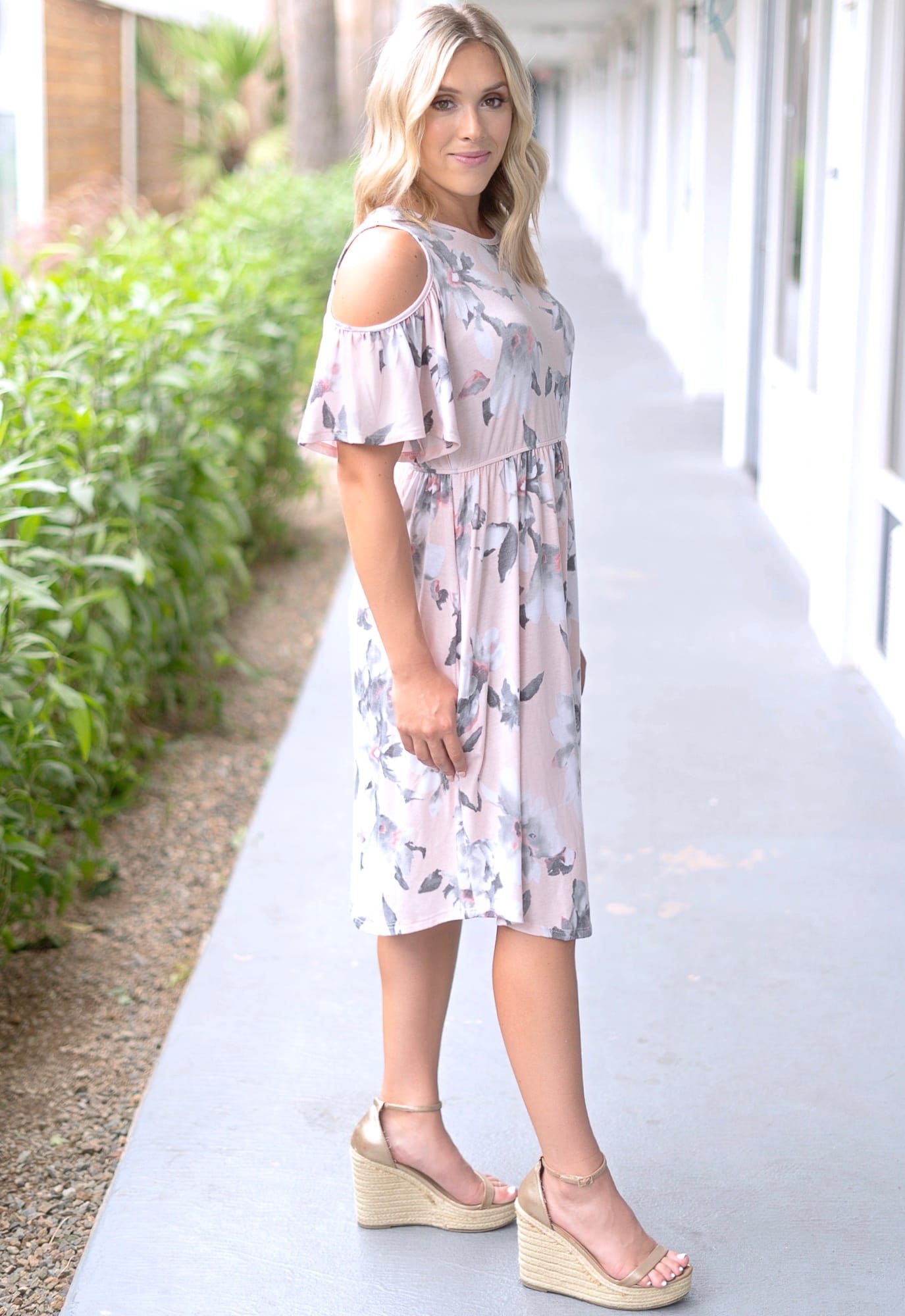 This flowy blush dress is the definition of floral chic! The open shoulder adds a flirty touch while the higher neckline provides coverage. The cinched waist is guaranteed to flatter any Mama’s figure. Not to mention, it has pockets for all your carrying needs! The blush base color and blue floral overlay are an adorable combo sure to flatter.