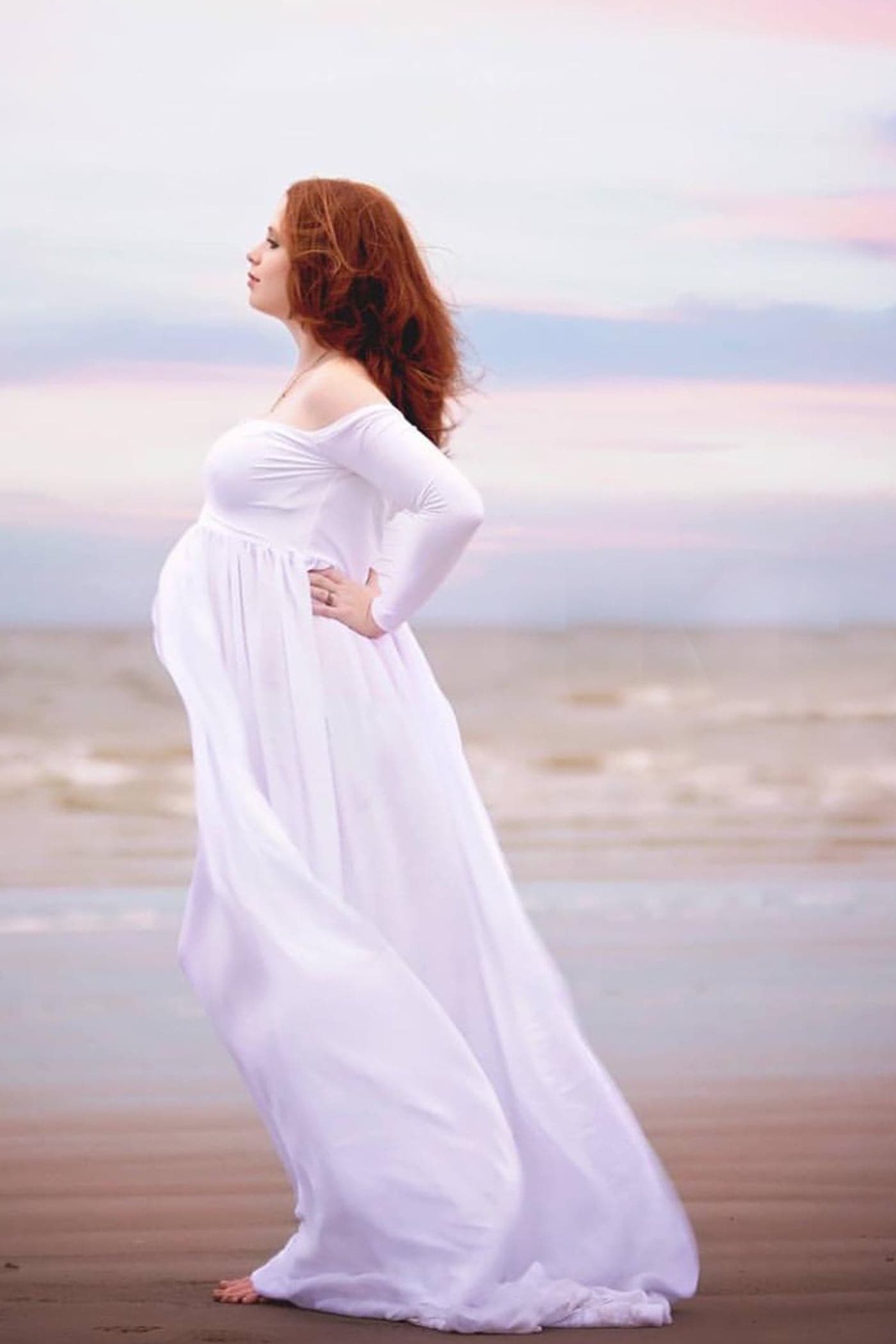 This off the shoulder long-sleeves flowy maternity gown is pure elegance and perfect for every season. The top is constructed of premium stretch material, with a chiffon bottom.