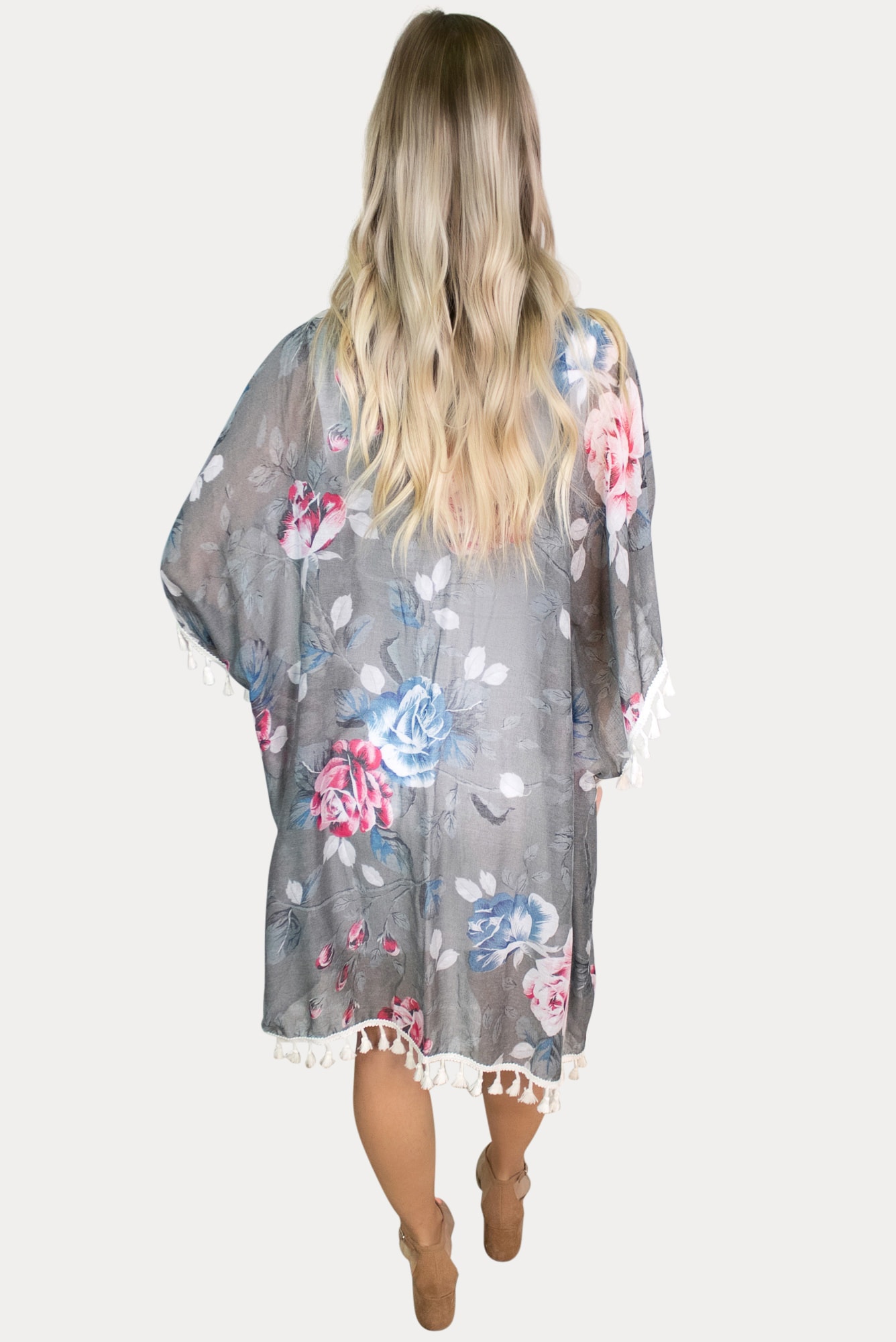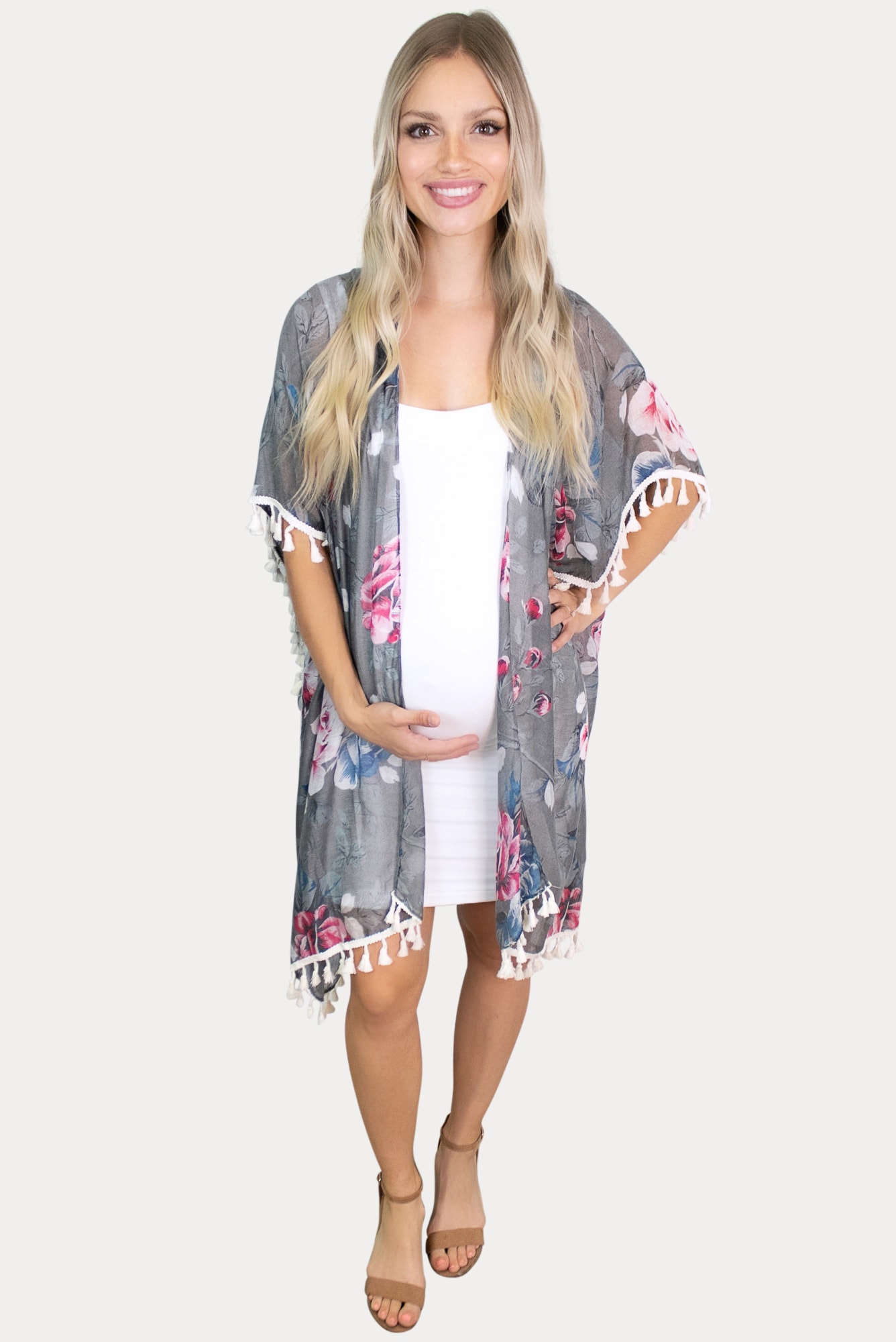 This grey floral maternity kimono is a must have for any mama looking to make a statement! It features cute tassels, soft material and bold florals. Perfect for dressing up your basics or keeping in casual chic. It pairs with both denim and dresses! Wear throughout pregnancy and beyond.