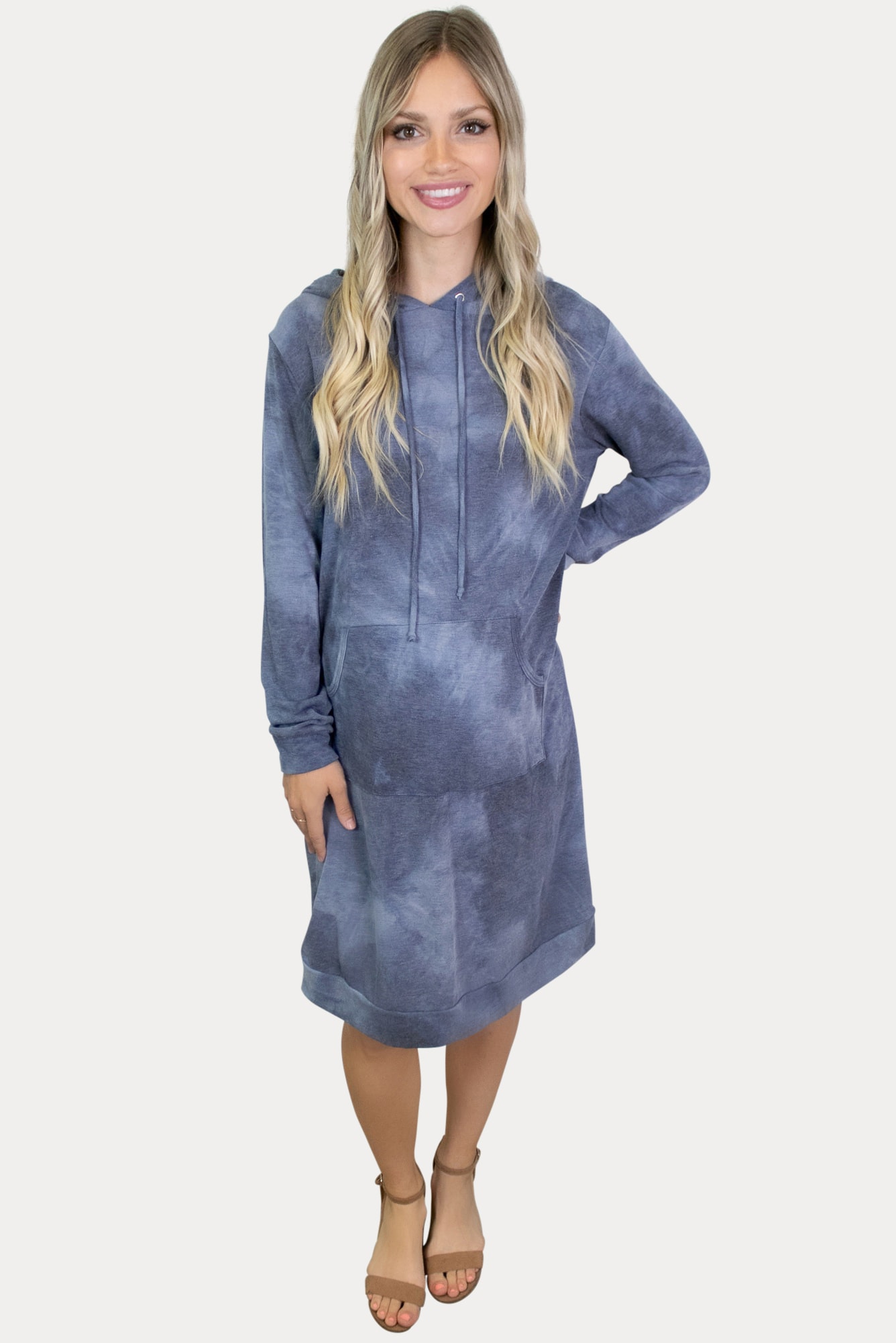 This tie dye hoodie maternity dress in blue will have you cozy and stylish all in one! Features long sleeves, a trendy tie dye pattern, and and even a hood to keep you cozy! Sure to be comfy and trendy at the same time. Ideal to wear throughout all nine months of pregnancy and beyond!