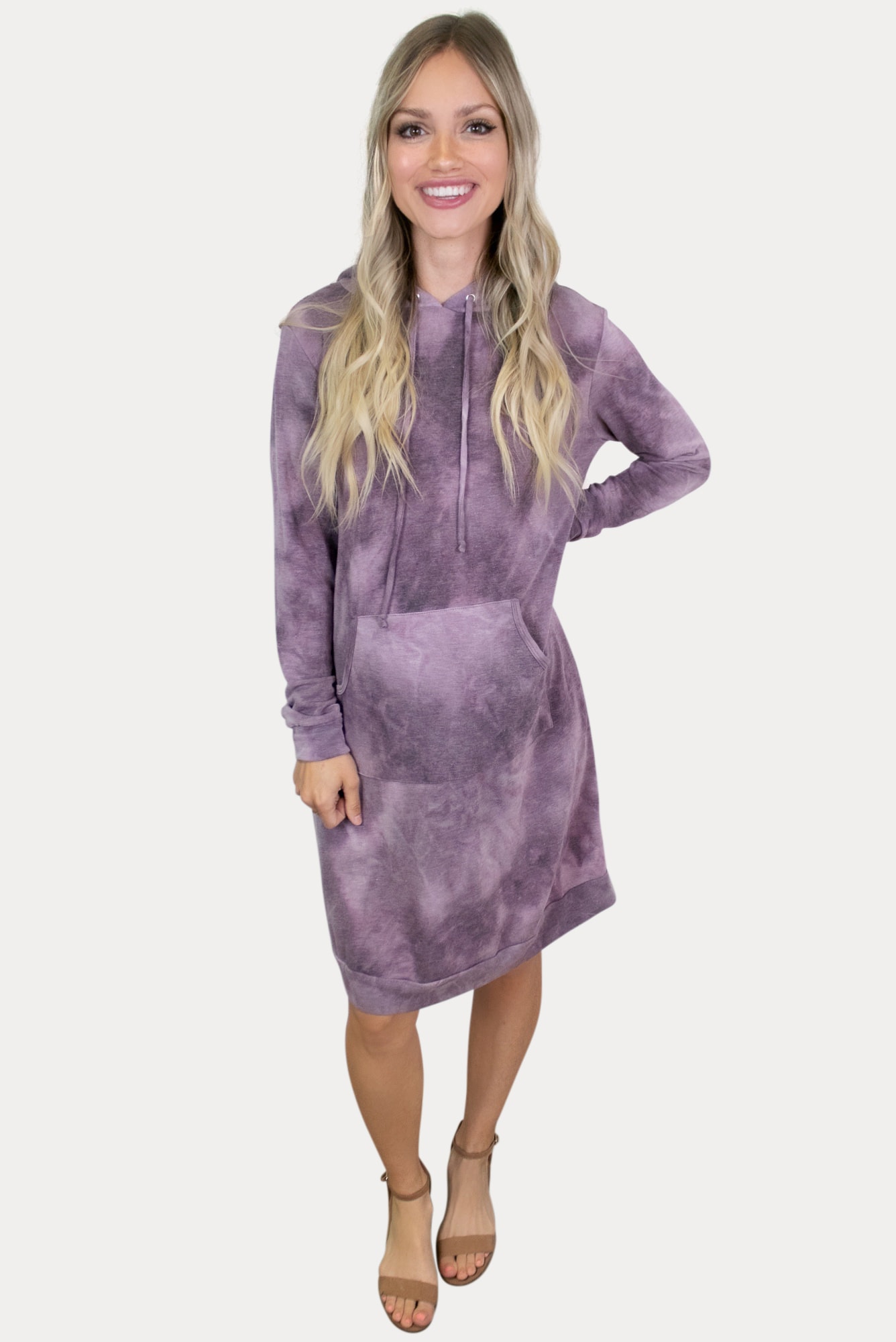 This tie dye hoodie pregnancy dress in purple will have you cozy and stylish all in one! Features long sleeves, a trendy tie dye pattern, and and even a hood to keep you cozy! Sure to be comfy and trendy at the same time. Ideal to wear throughout all nine months of pregnancy and beyond!