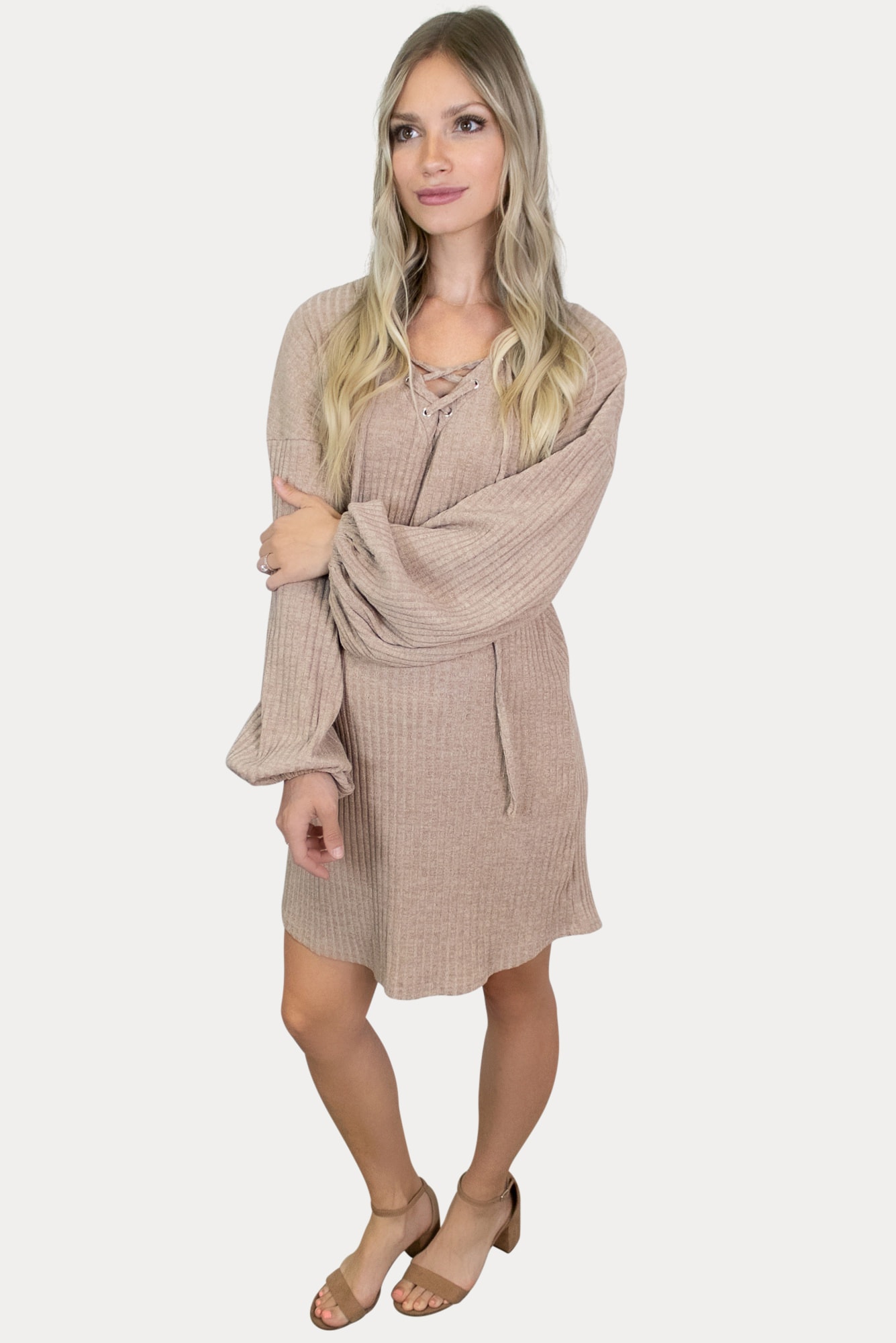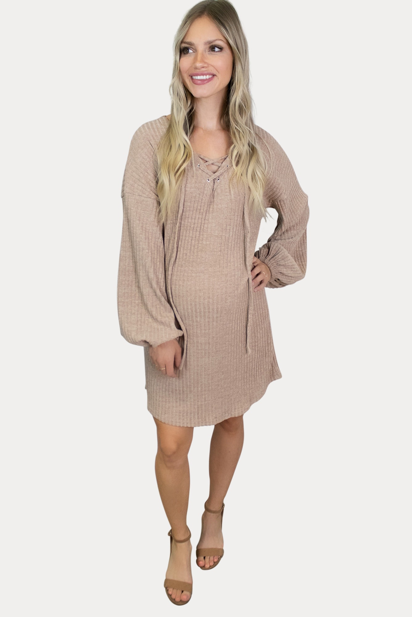 Ultra comfort alert! This knit maternity dress is sure to keep you cozy and stylish all year long! Our looser fitting dress has the perfect amount of room for you and your growing bump! Featuring a criss-cross front with ties and ballon sleeves, this dress screams comfort! Great for running errands, grabbing lunch or lounging around the house. Ideal to wear throughout pregnancy and beyond!