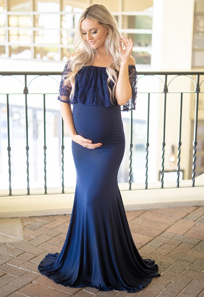 Our Lace Off the Shoulder Maternity Gown is the perfect photoshoot or special event maternity gown! With subtle ruffle detailing, a simple flare, and a premium stretch material this gown is equal parts comfort and elegance. Because it has a closed front, it is the perfect maternity gown for a photoshoot, baby shower or any special occasion. (Pictured in Navy.)