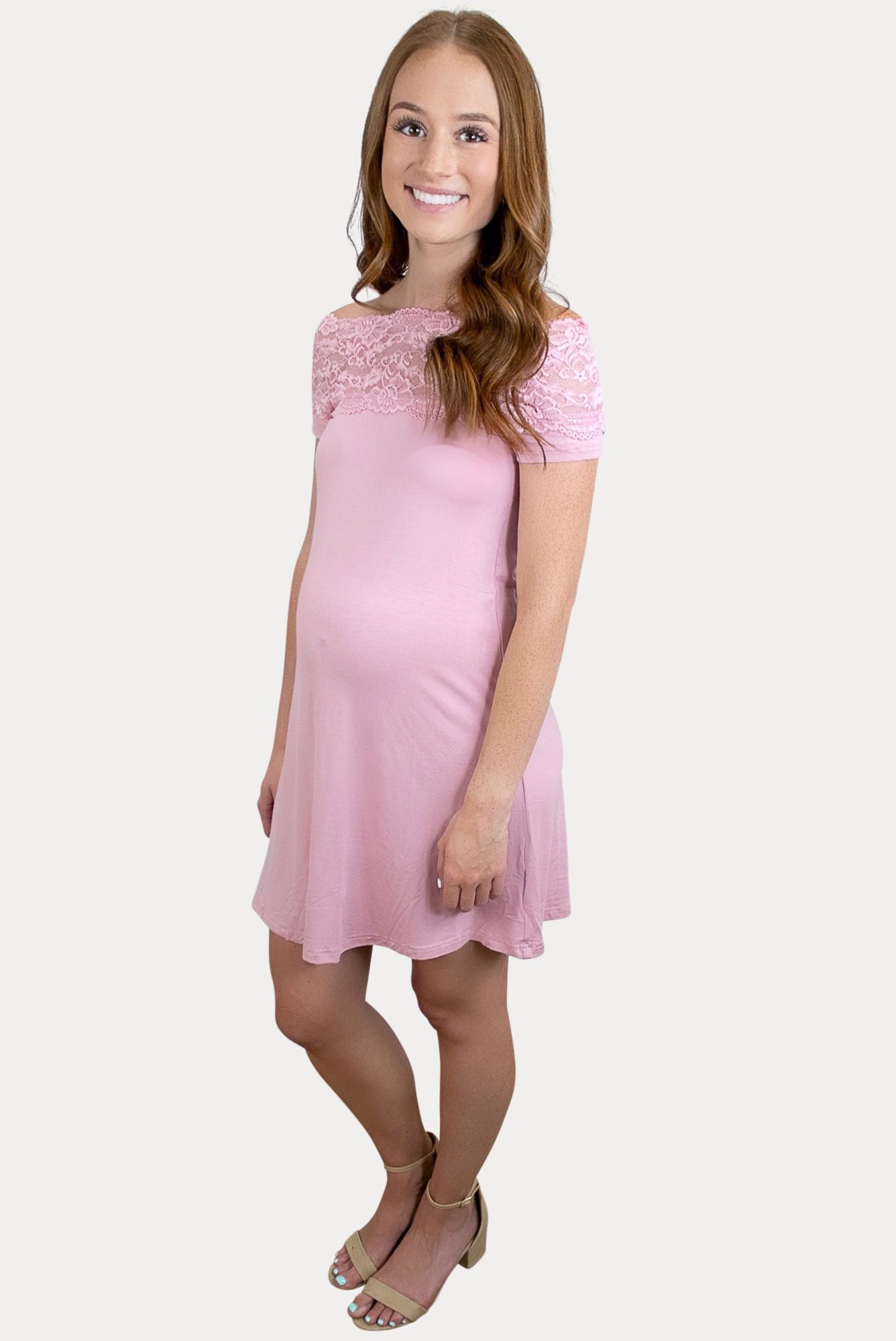 Your new favorite warm weather dress! This lace trim pregnancy dress in mauve features an adorable form fitting lace trimmed top and comfortable fit. Perfect for everyday errand running or date nights! Pair this lace trim pregnancy dress with wedges, sandals or some cute heels for day or night wear. Ideal to wear throughout pregnancy and beyond!