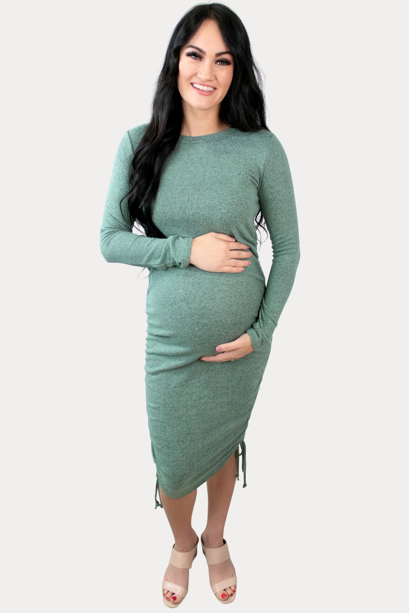 We cannot get enough of this ultra-soft long-sleeve pregnancy dress! While hugging all your curves, this cozy material will provide a flattering appearance for any Mama! And don’t forget the side ties at the bottom for a bit of added style! Great for all nine months of pregnancy and beyond.