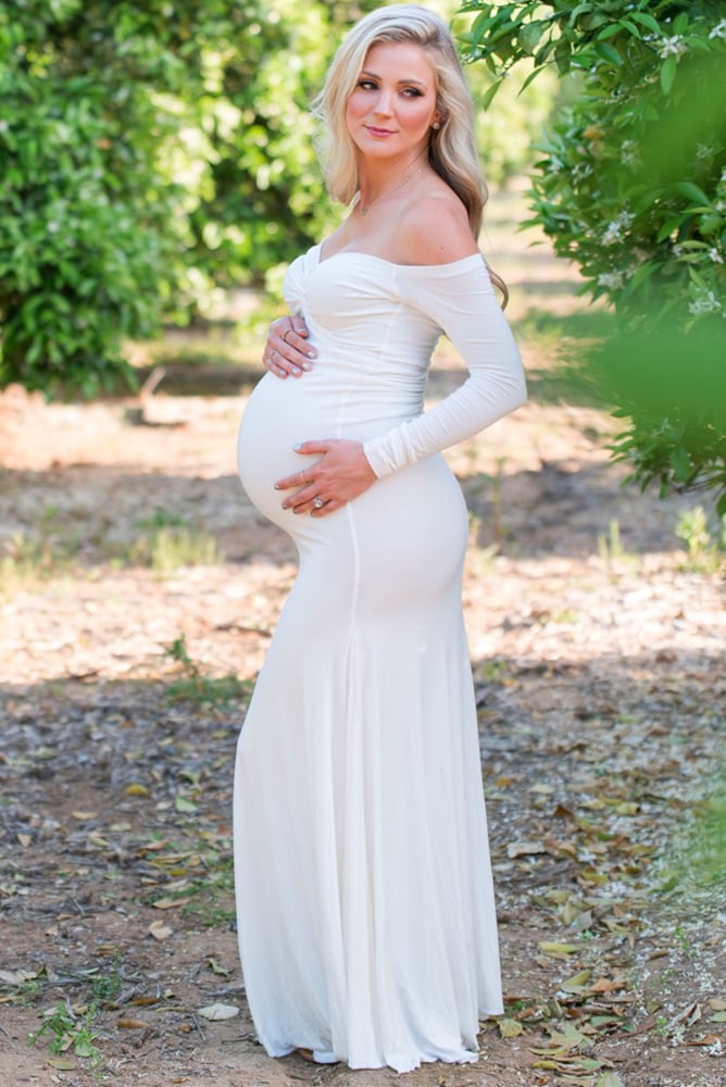 This ruched front wedding dress is truly timeless elegance! Made with a premium stretch material, this gown is equally stunning and comfortable. The flare bottom will perfectly transition from ceremony to reception. This is a gorgeous long sleeve maternity wedding dress that will have all eyes on you! (Pictured in Cream.)