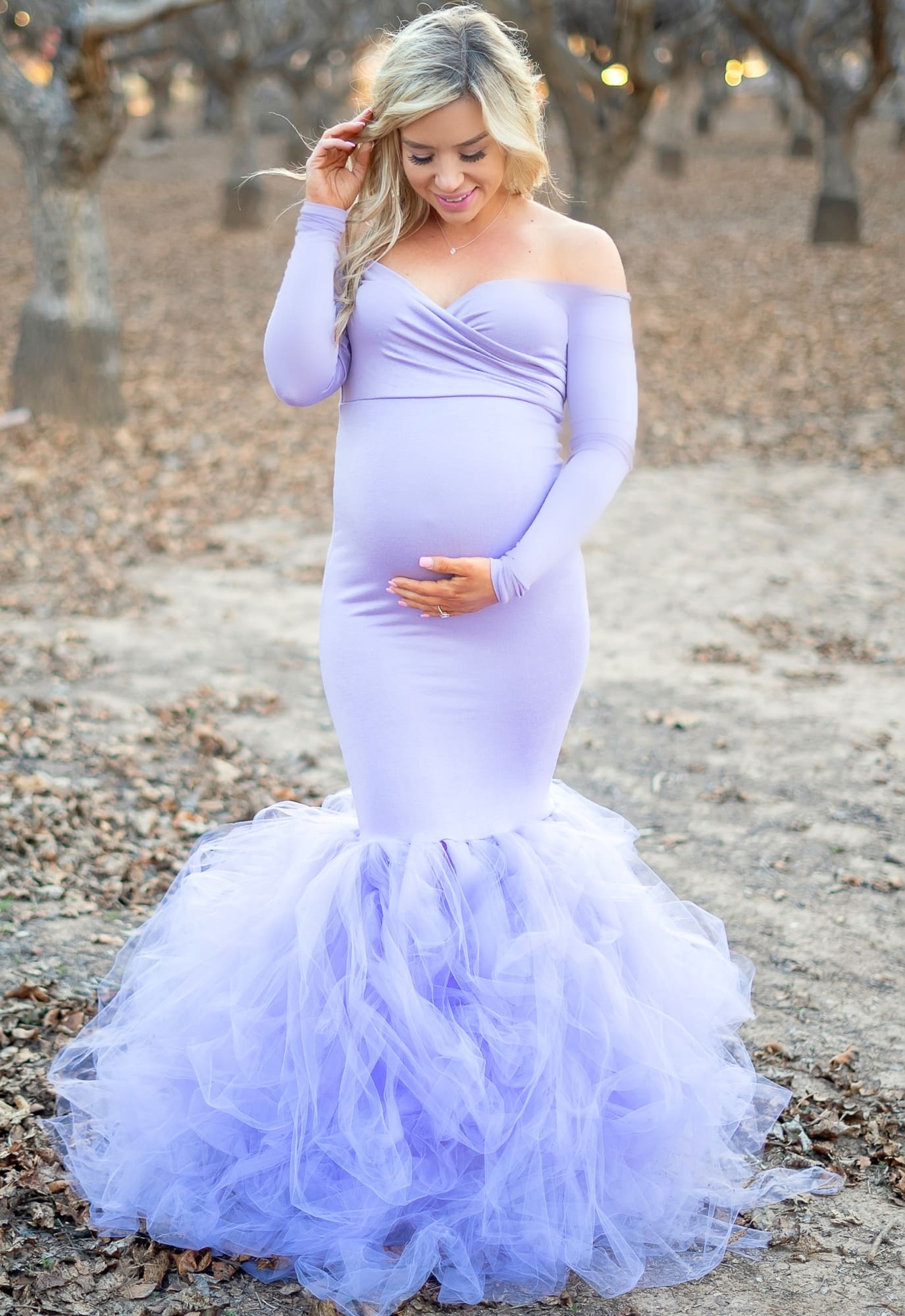 Our Off-the-Shoulder Sweetheart Tulle Gown is like stepping into a movie! A long sleeve princess maternity gown, constructed of premium stretch material on the bodice with a handcrafted tulle bottom. This gown is pure elegance and is perfect for your maternity photoshoot but also any other special occasion.