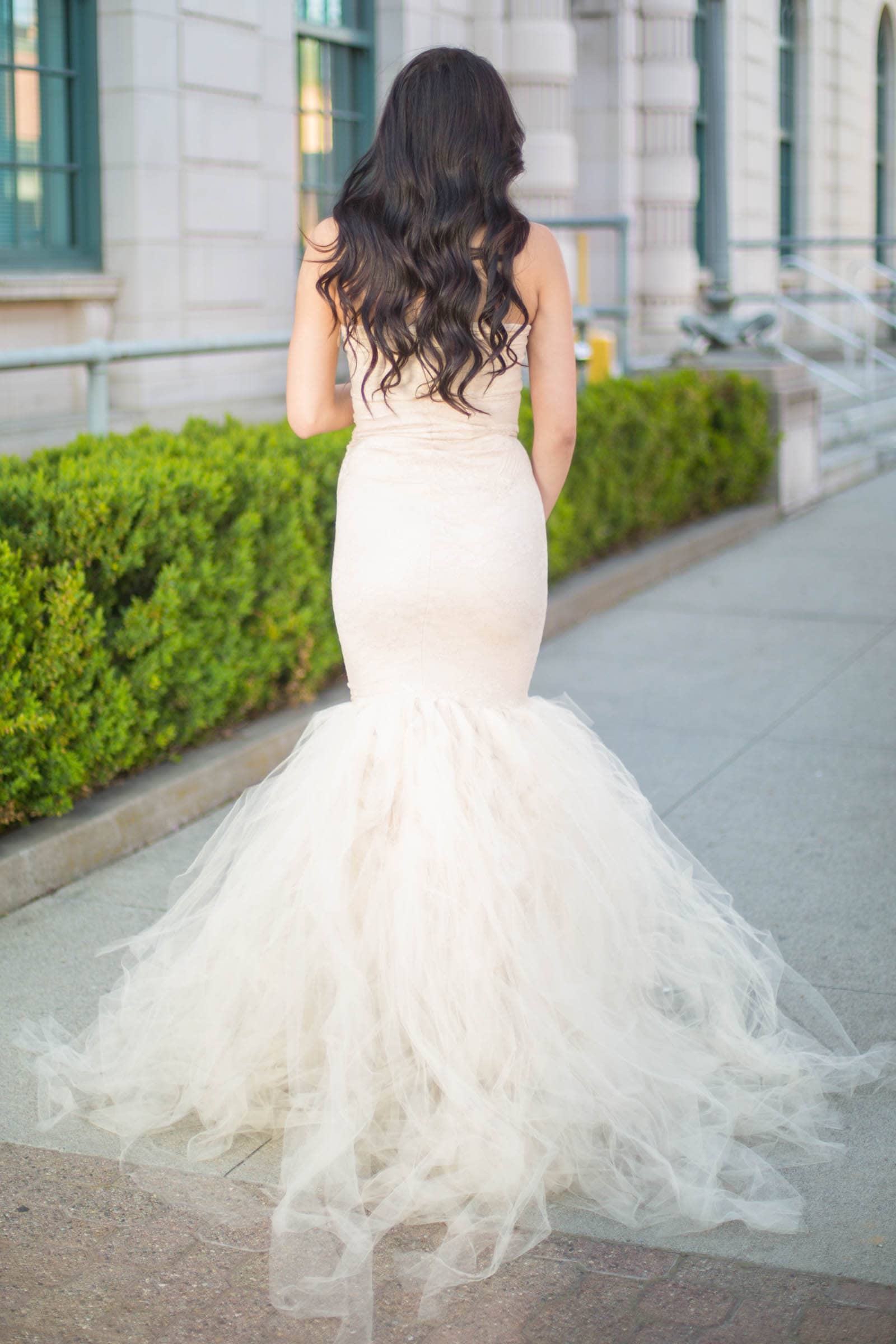 This maternity bridal gown is take your breath away beautiful for your big day! With a strapless lace top and princess-like tulle bottom, this gown screams elegance. Constructed of lace, tulle, and a premium stretch material that allows comfort while looking your best.