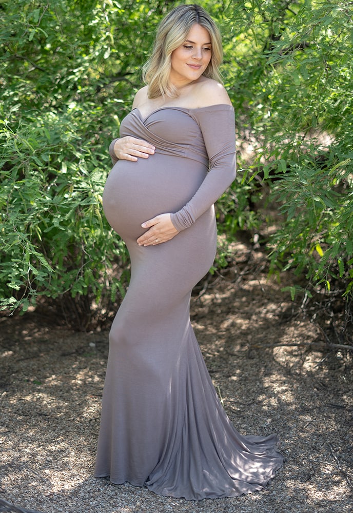 Our Long-Sleeve Off the Shoulder Sweetheart Gown with Mini Train is a perfect photoshoot or special event maternity gown! With a cross over sweetheart bust, a slim fit bodice, a simple mini train, and ultra-soft, stretch material this gown is equal parts comfort and elegance. This gorgeous maternity gown with a small train is perfect for any occasion! (Pictured in Toffee.)