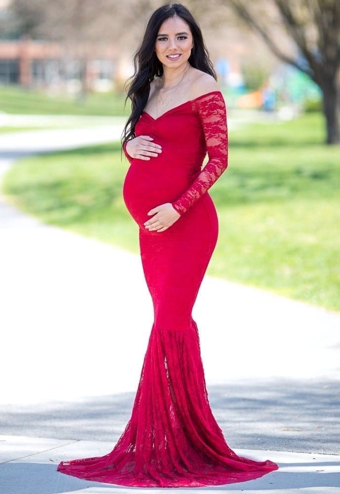 This full-lace long-sleeve mermaid maternity gown is pure elegance and perfect for every season. The dress is constructed from stretchy lace with premium stretch material lining on the bodice with unlined lace on the bottom. This design is perfect for your maternity photoshoot or any special occasion. (Pictured in Red.)