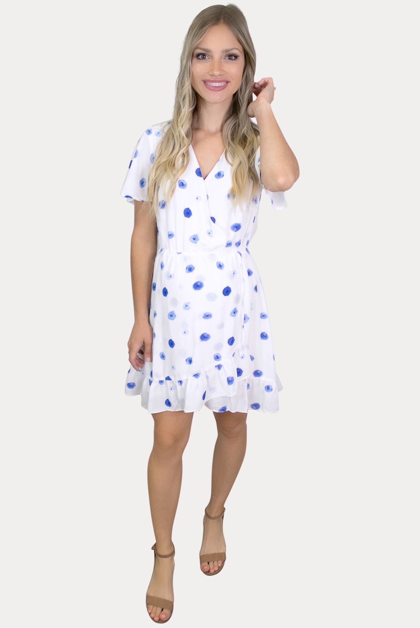 Check out this polka dot pregnancy ultra-mini dress! Featuring a light material, cute v-neck top, and ruffling at the bottom, it is the perfect item dress up or down for a variety of fun looks. Ideal for your upcoming baby shower or baby sprinkle. Wear throughout all nine months of pregnancy and beyond!